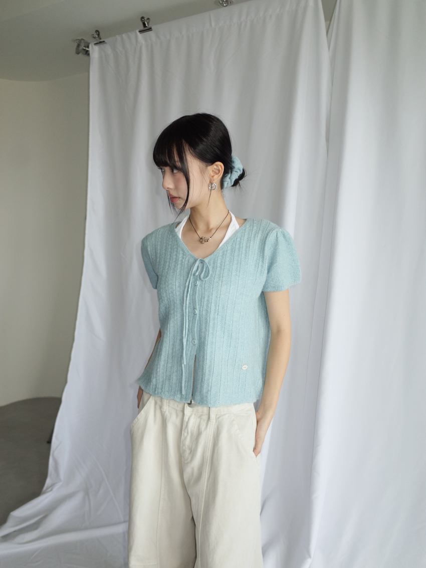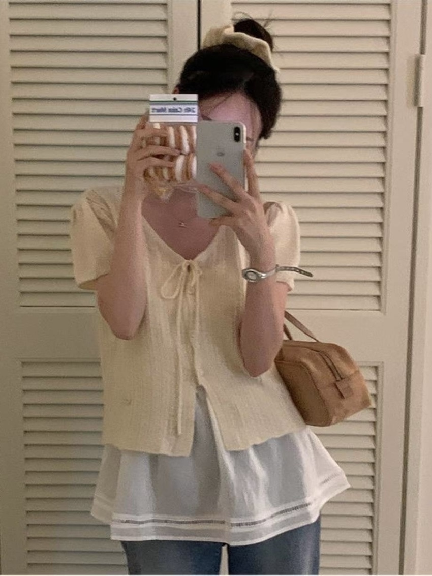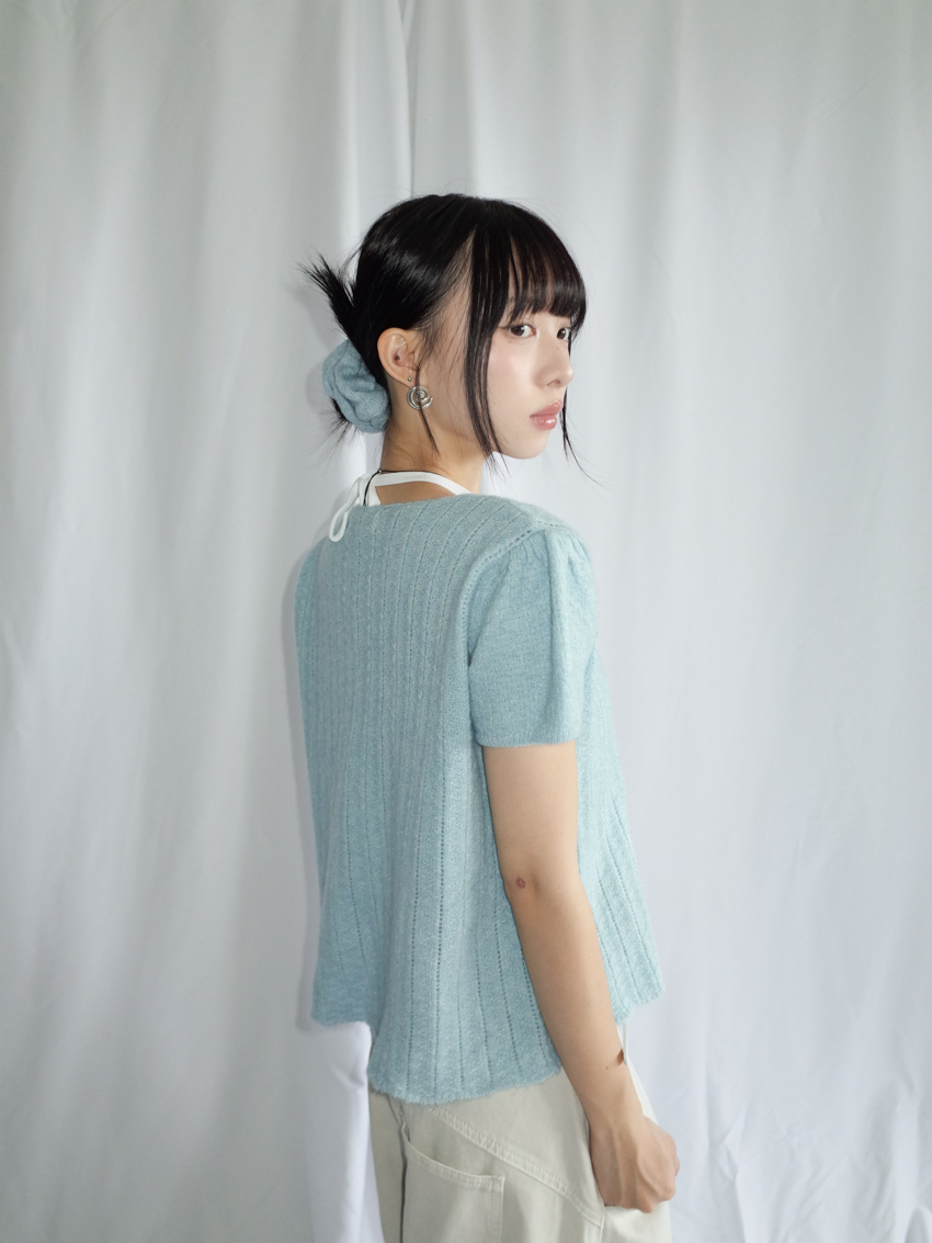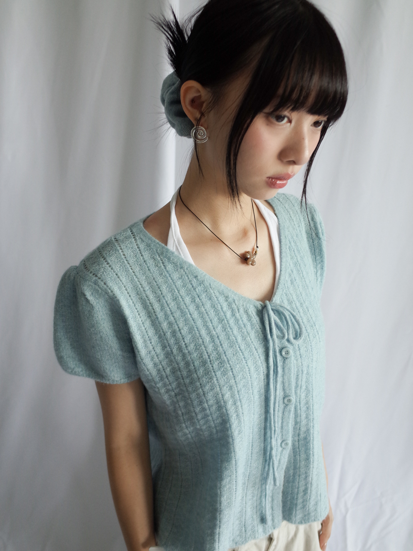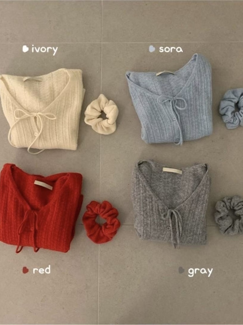 cotton-soft puff-sleeve knit button top with matching scrunchie