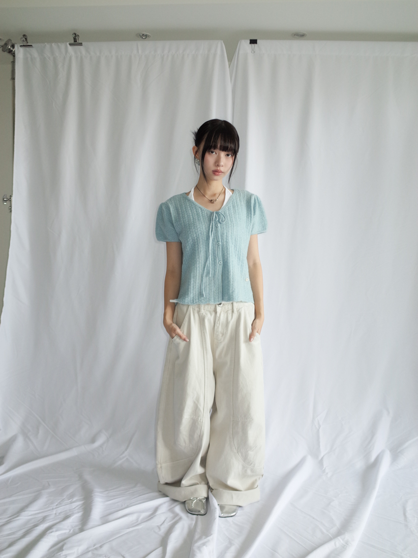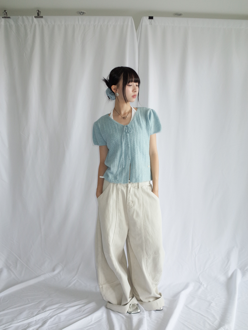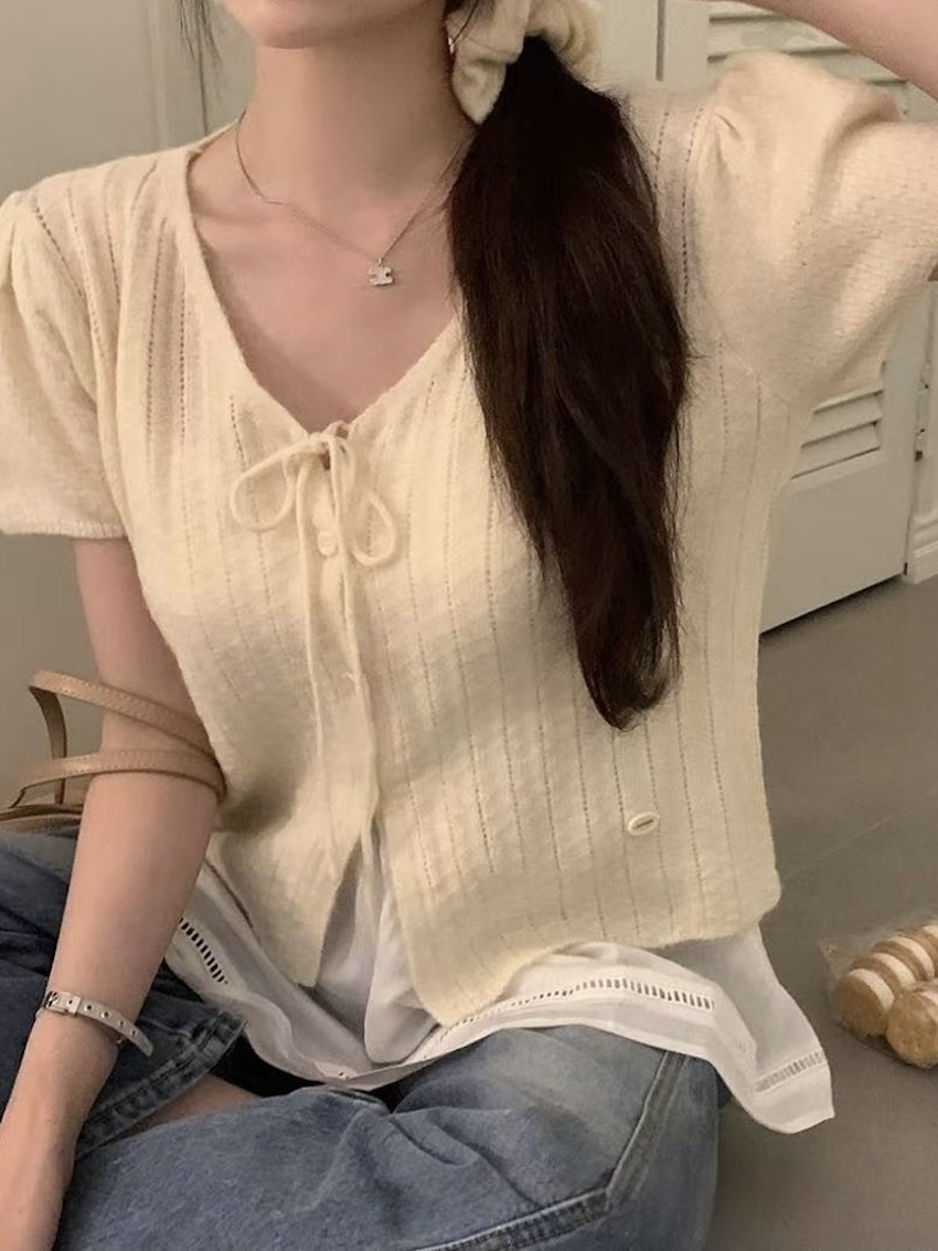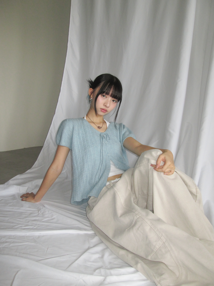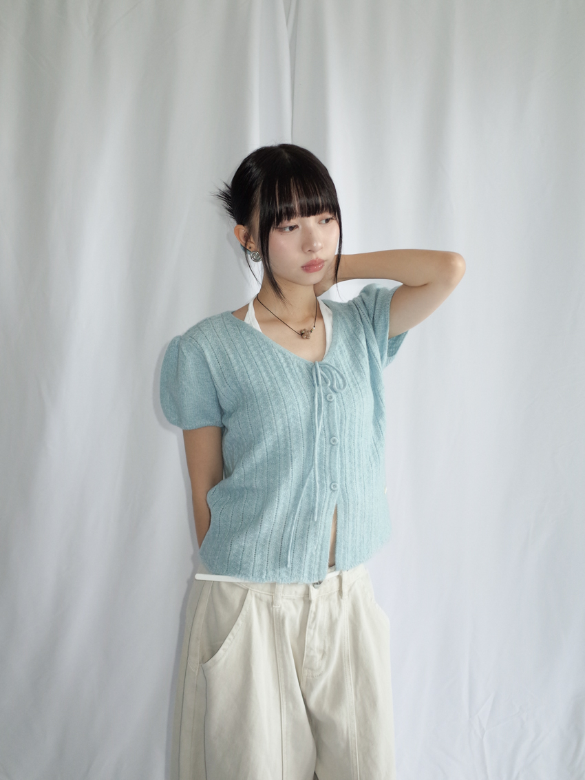 cotton-soft puff-sleeve knit button top with matching scrunchie