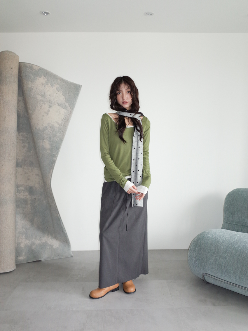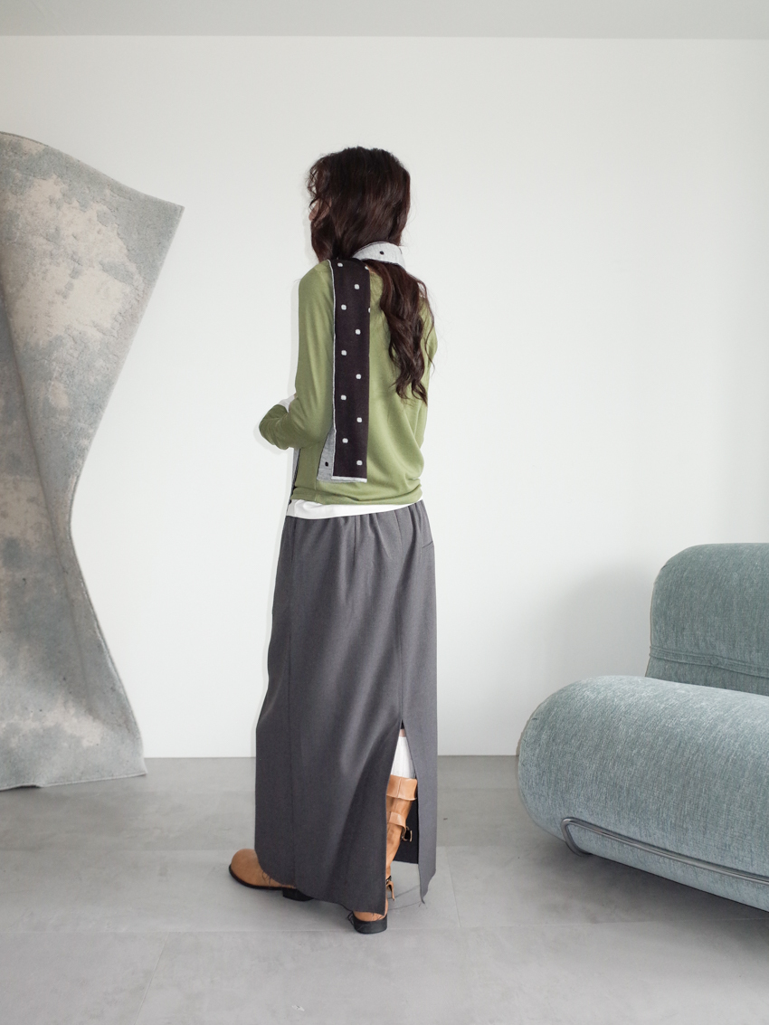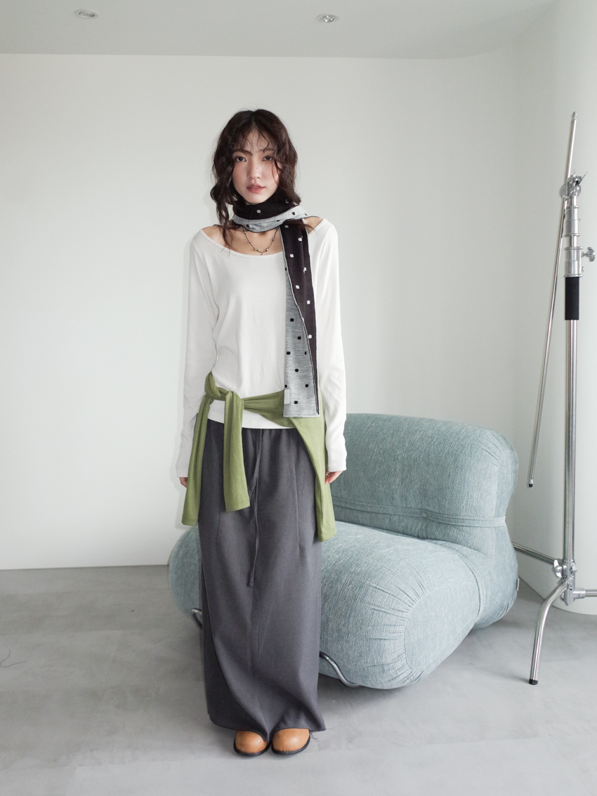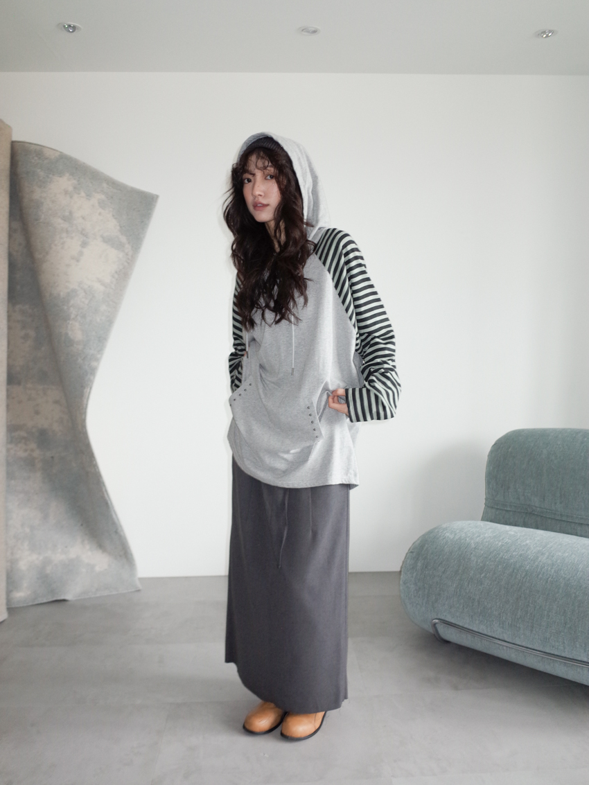 elastic drawstring stripe raw-edge back slit skirt in CHARCOAL