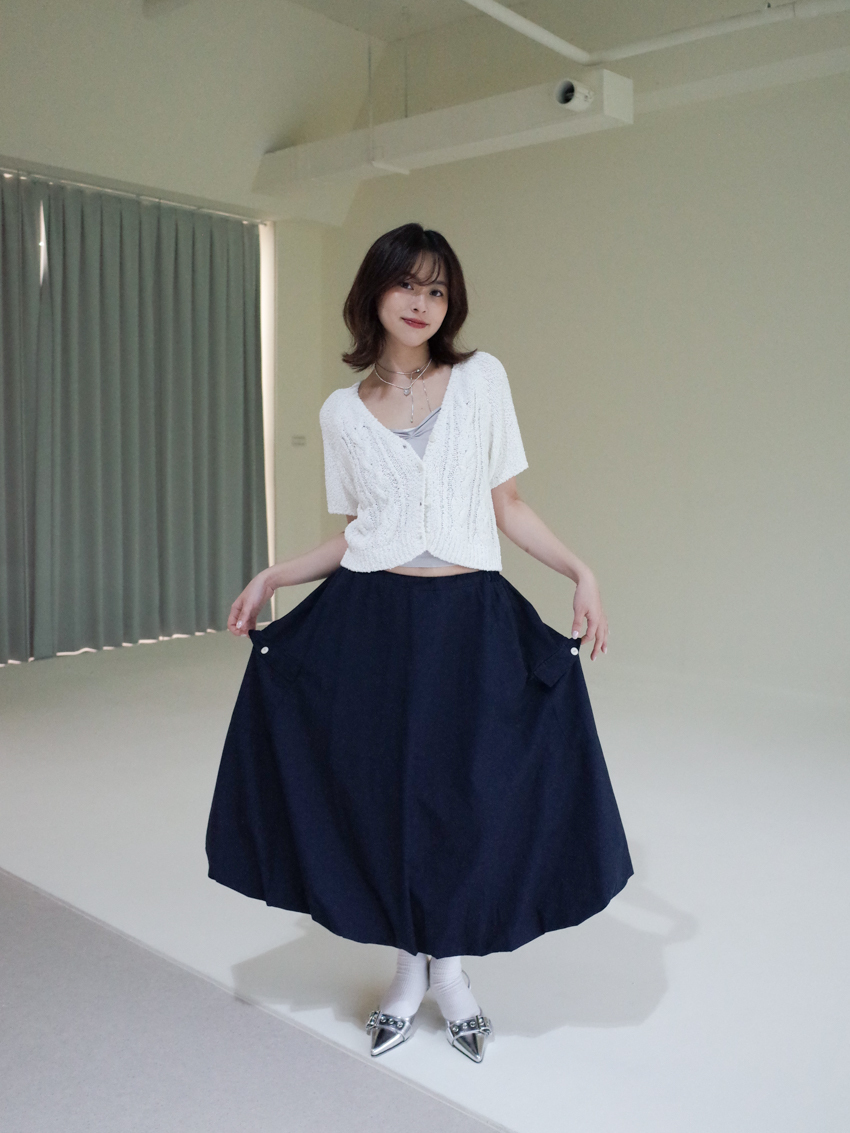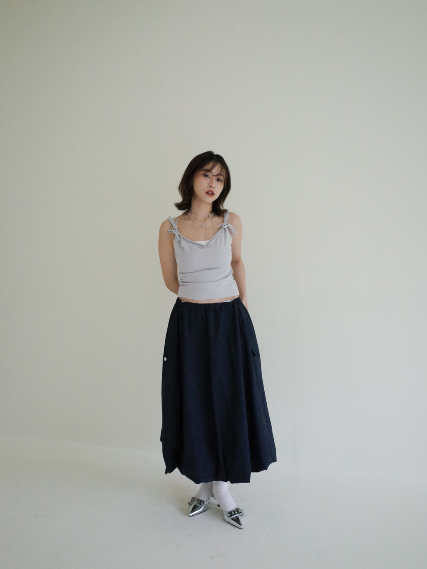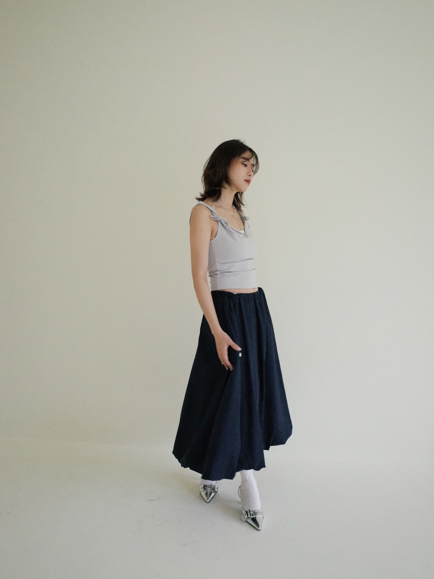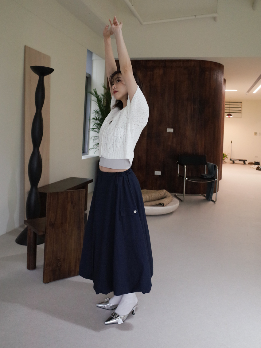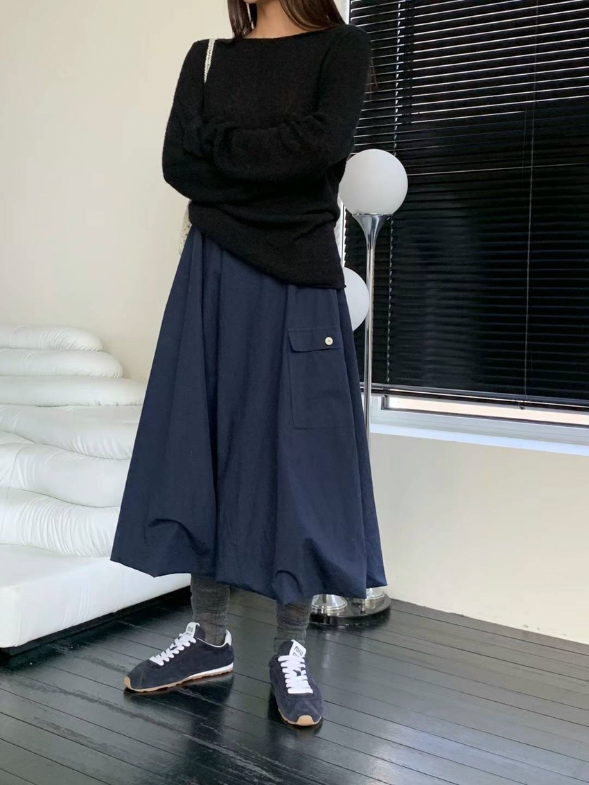 Magnetic A-line waist elastic midi bud skirt in NAVY