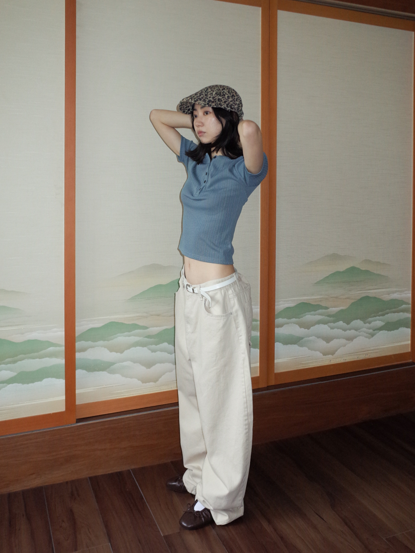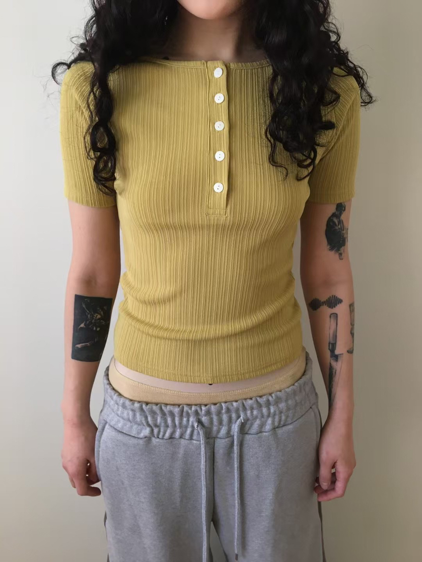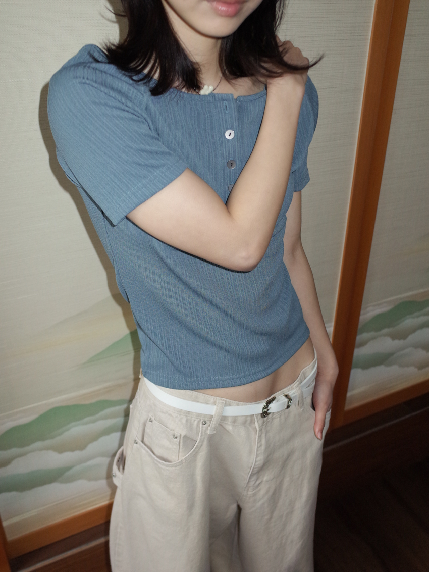 matte gloss button-up wide collar short sleeve top