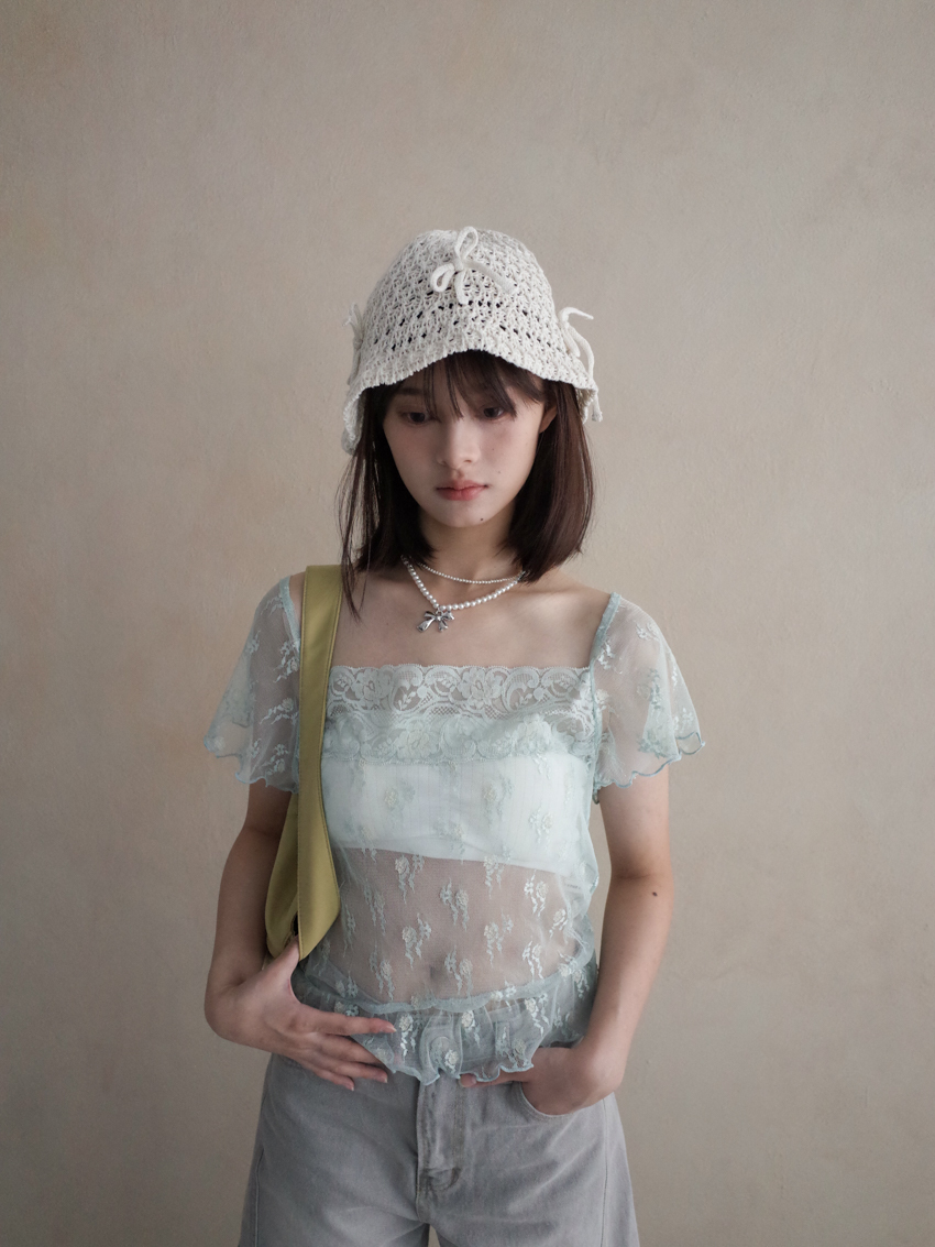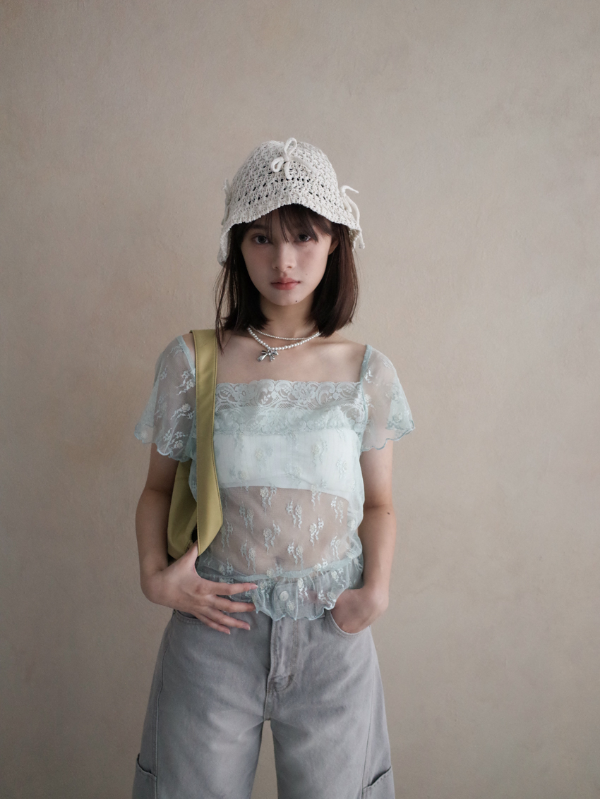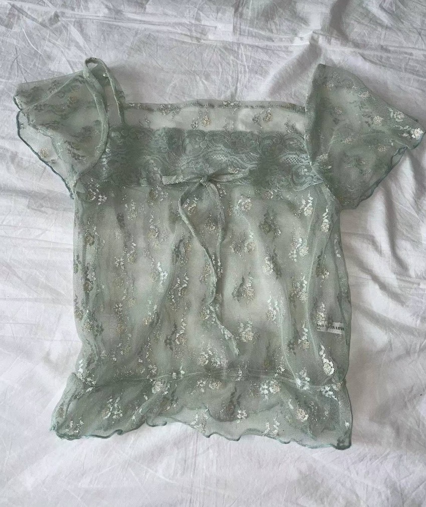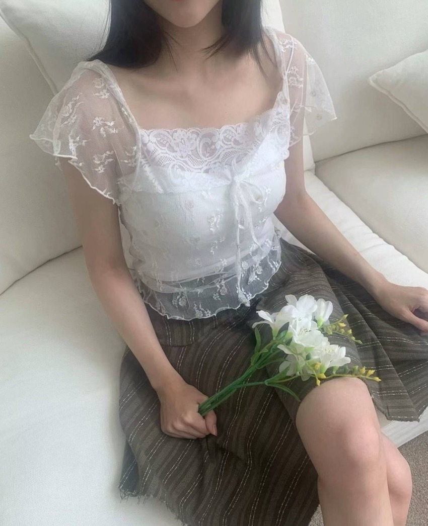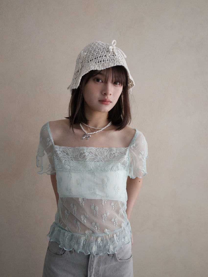sheer lace knotted small flower embroidered square neck top