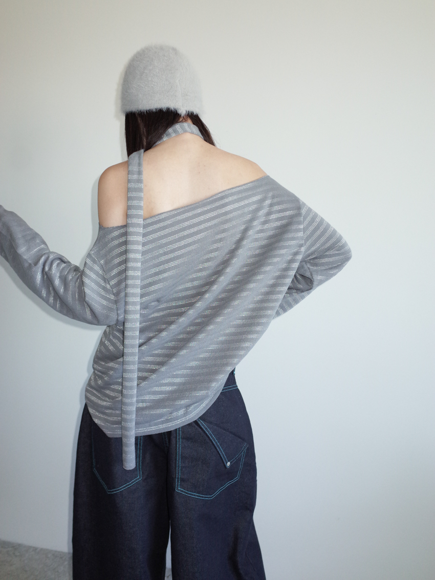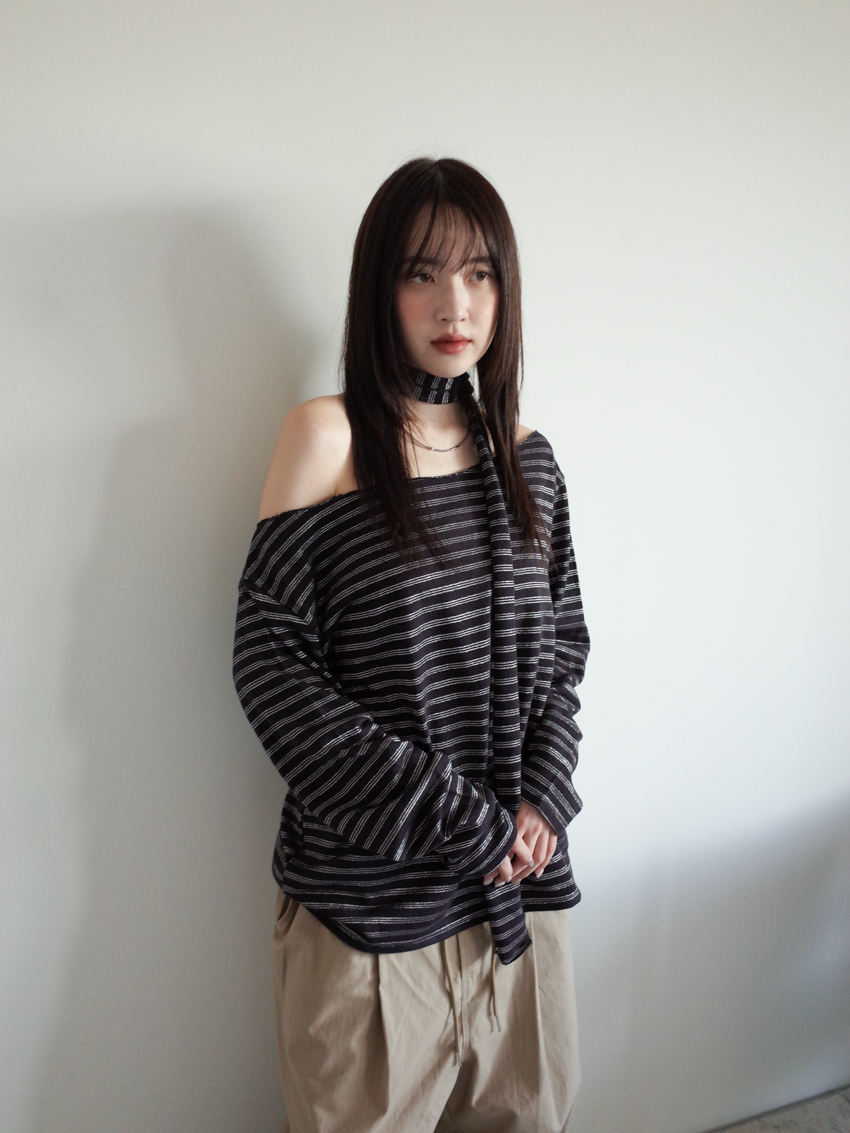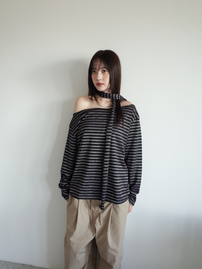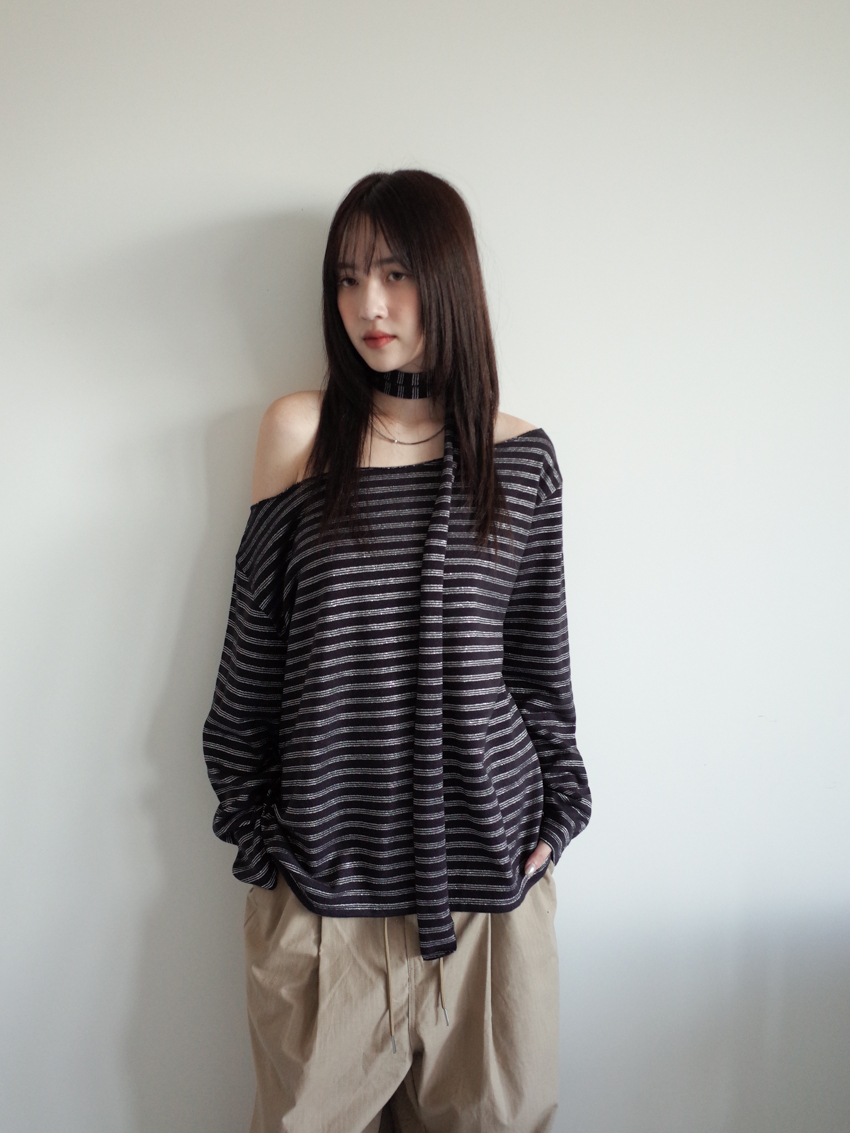 silver-stripe wide-neck top with neck scarf