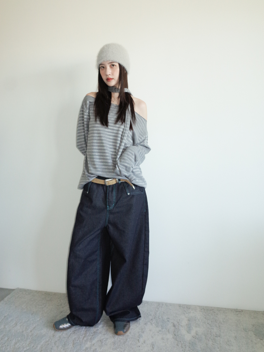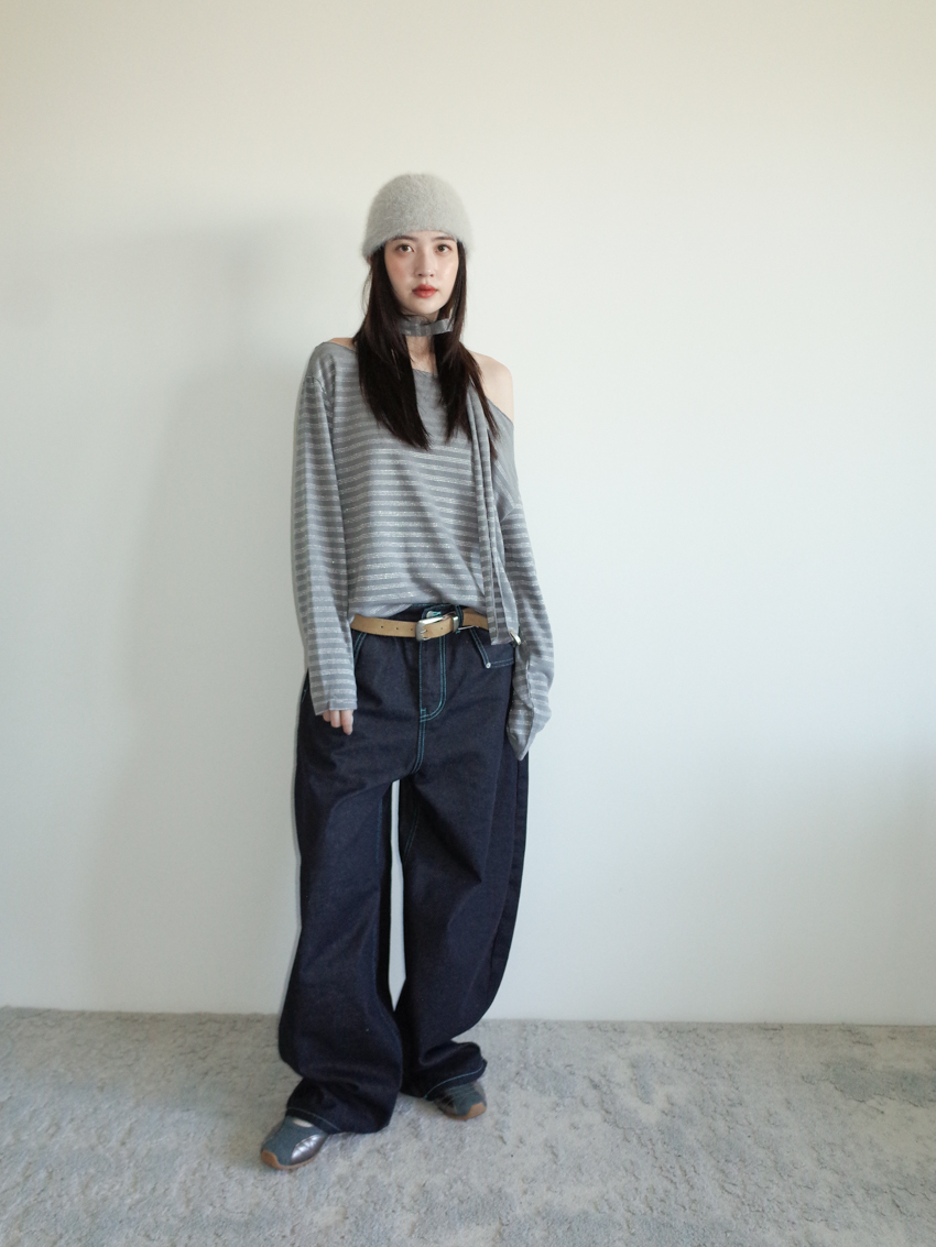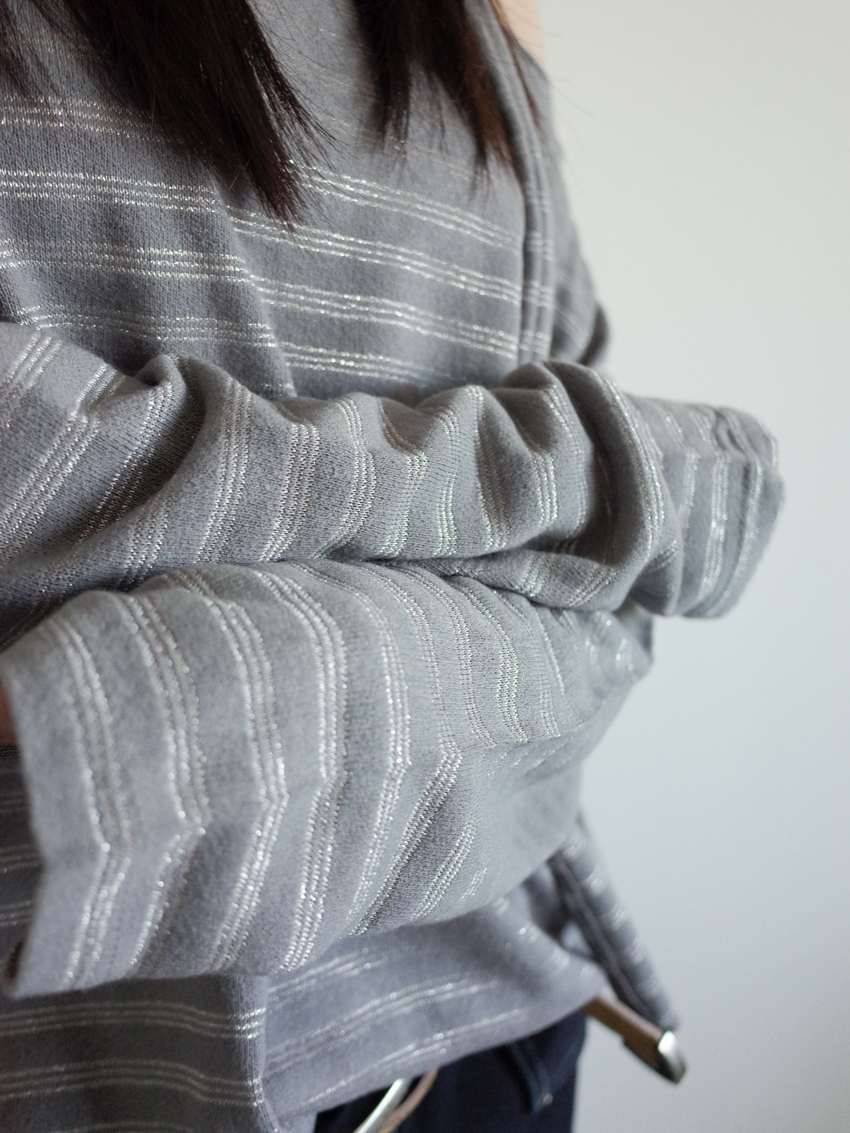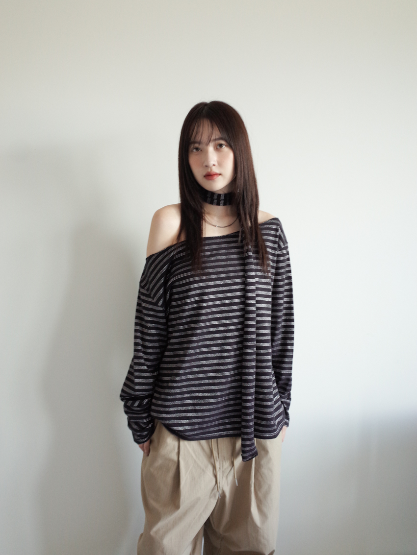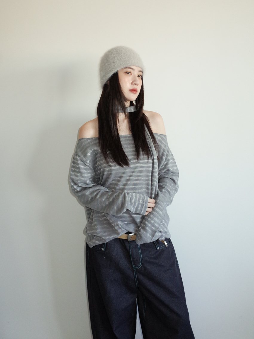silver-stripe wide-neck top with neck scarf