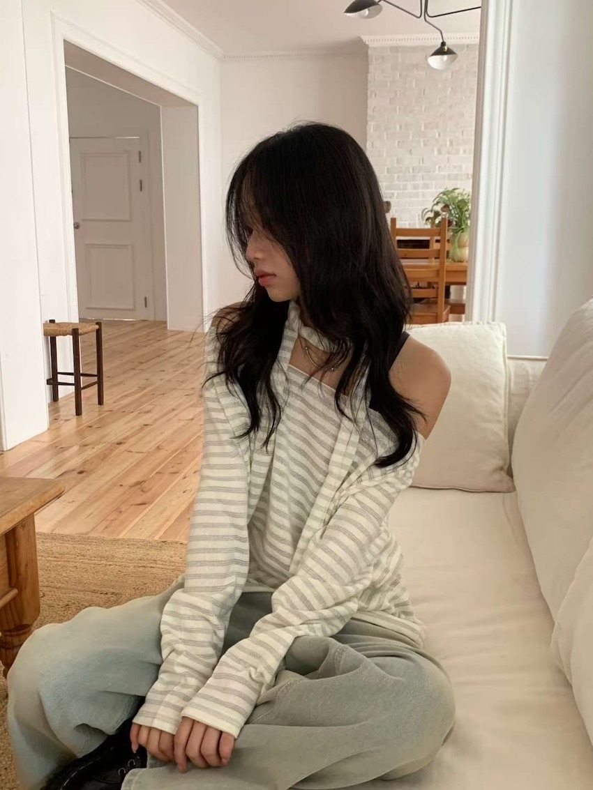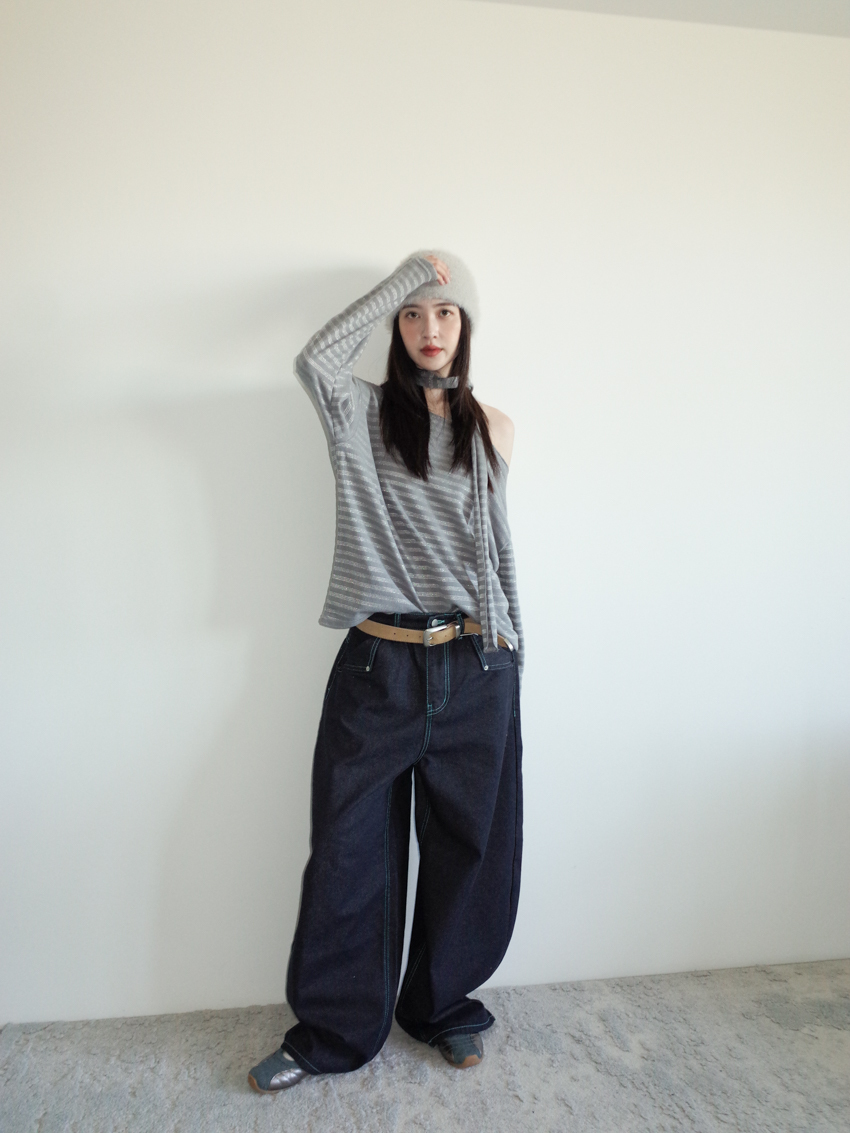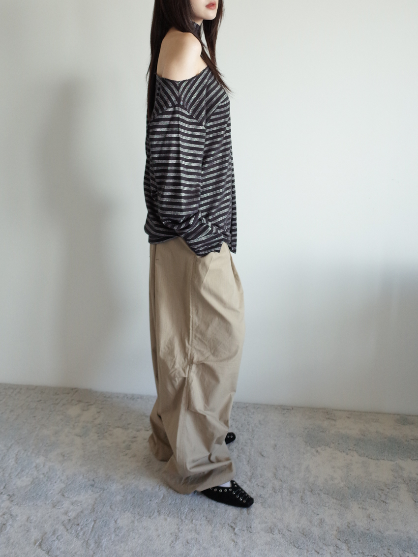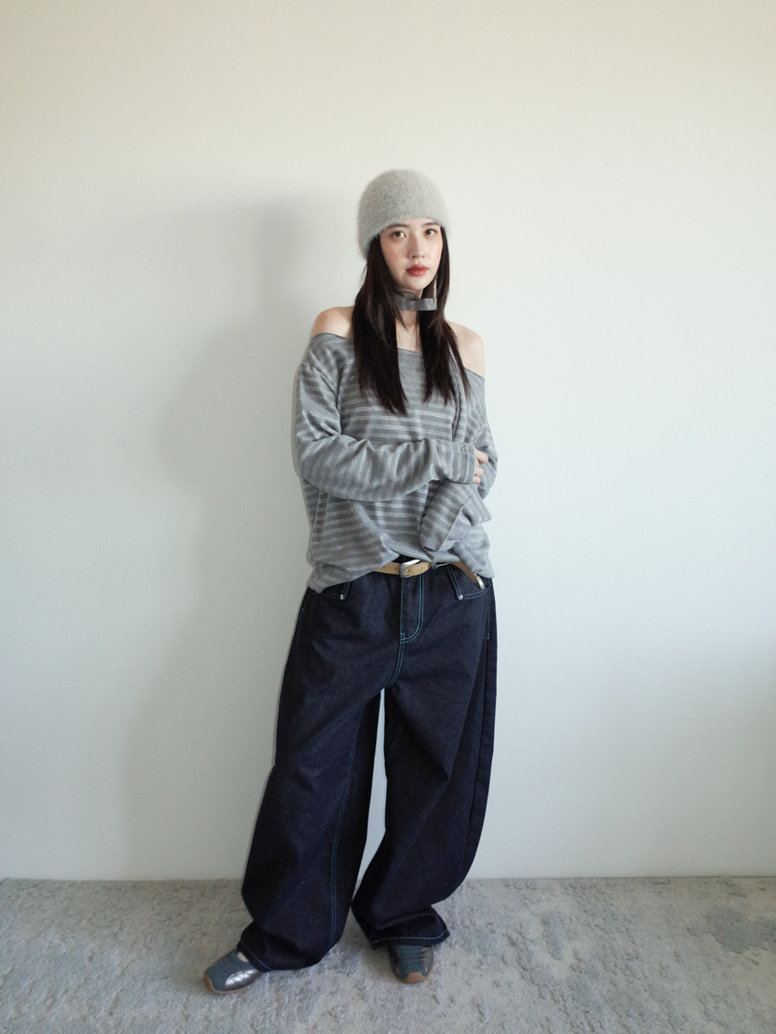 silver-stripe wide-neck top with neck scarf