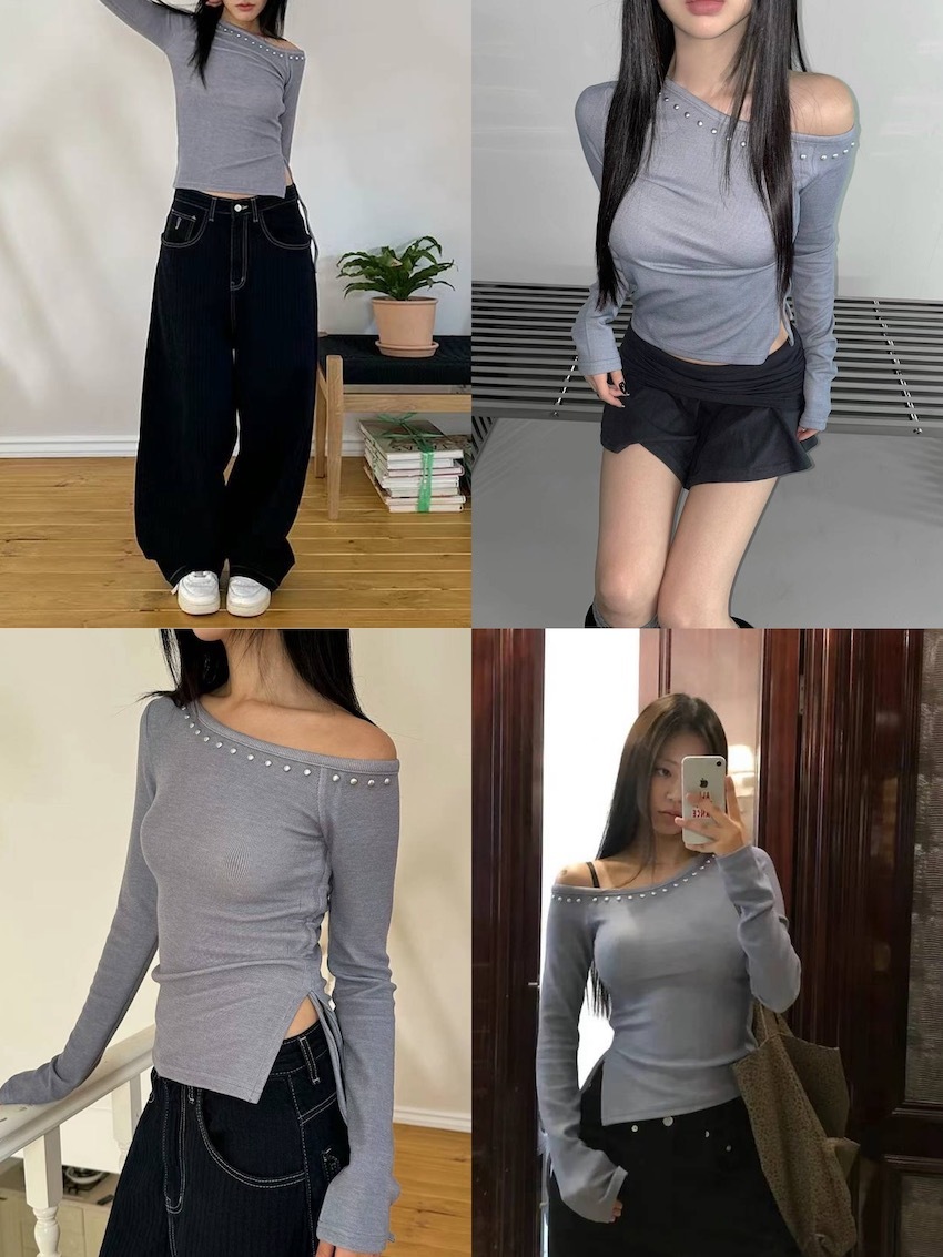 studded one-side ruched off-shoulder top