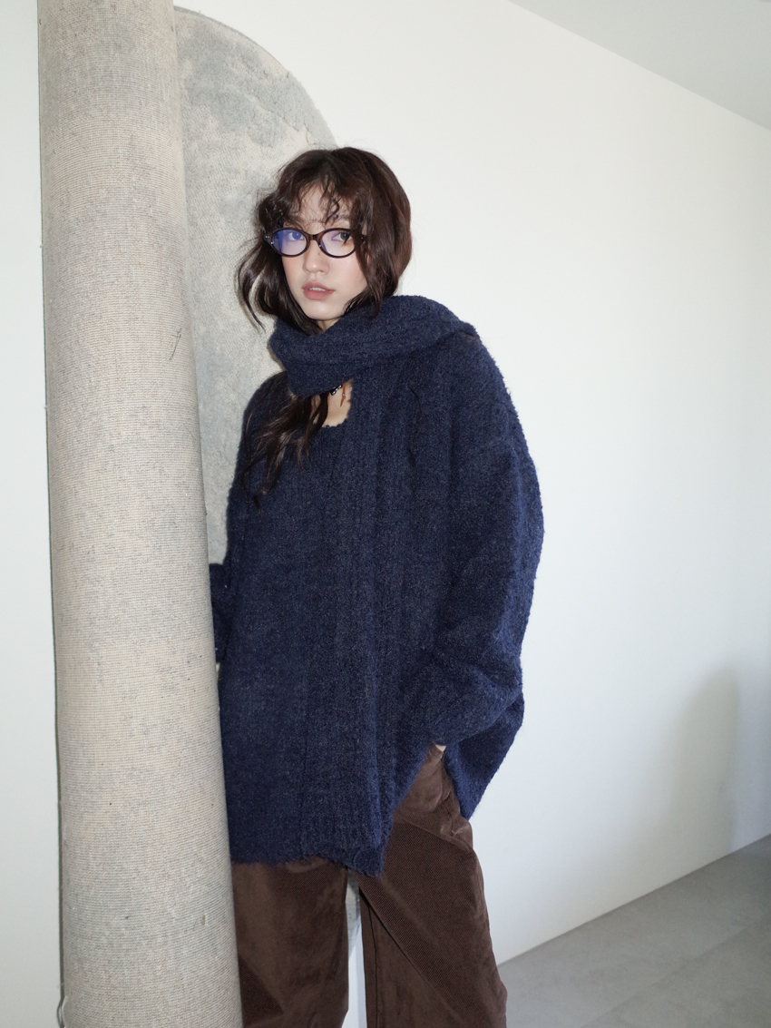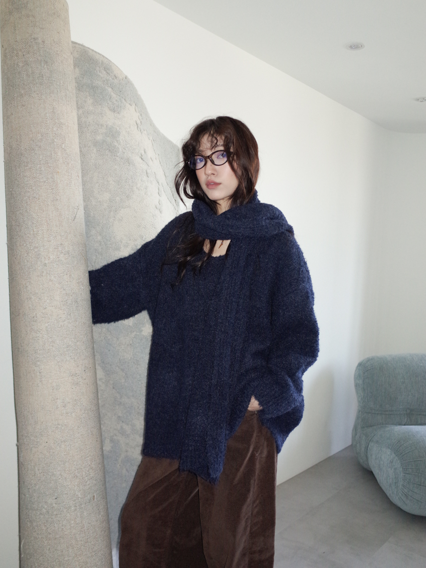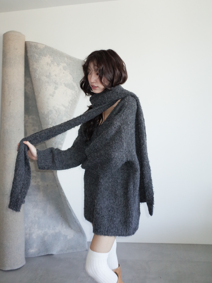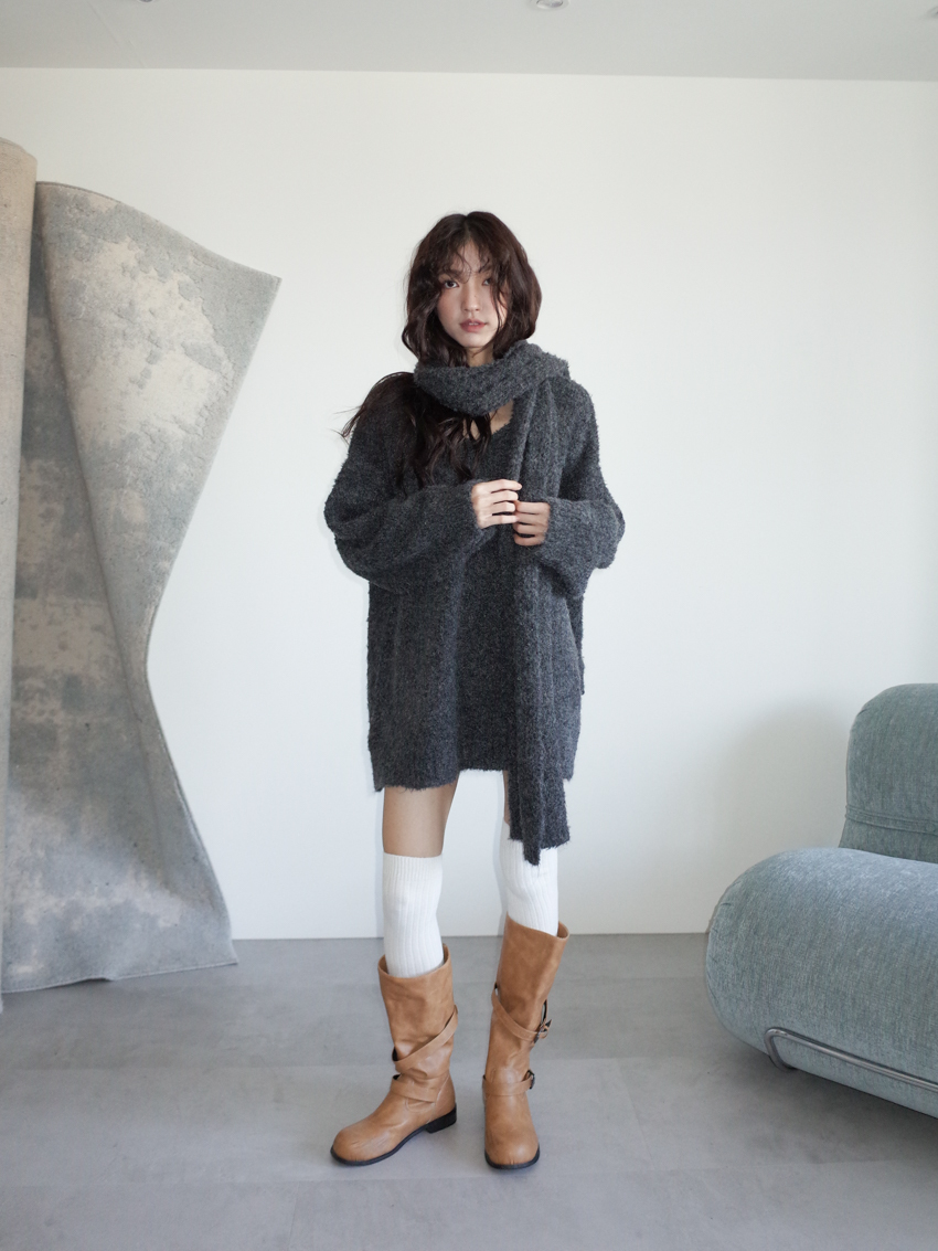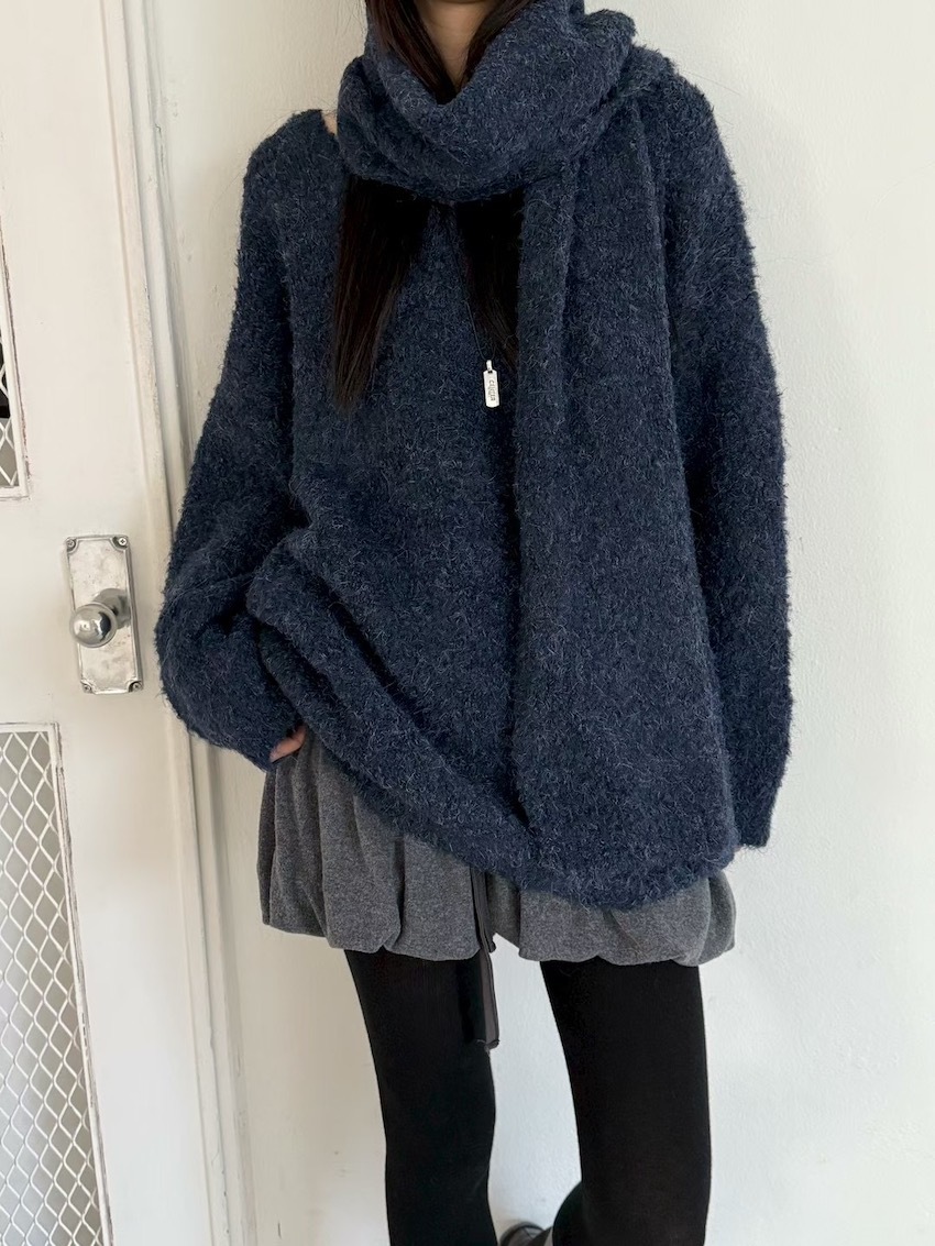 teddy plush slub knit slouchy sweater with scarf