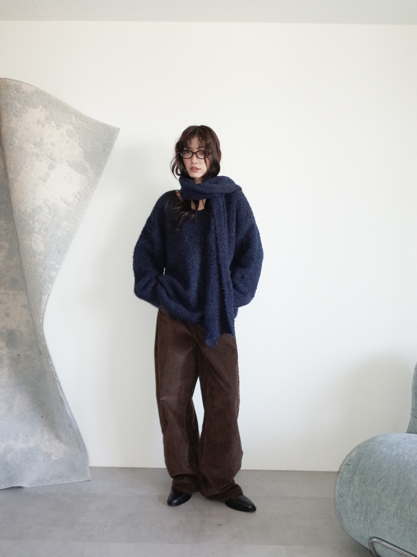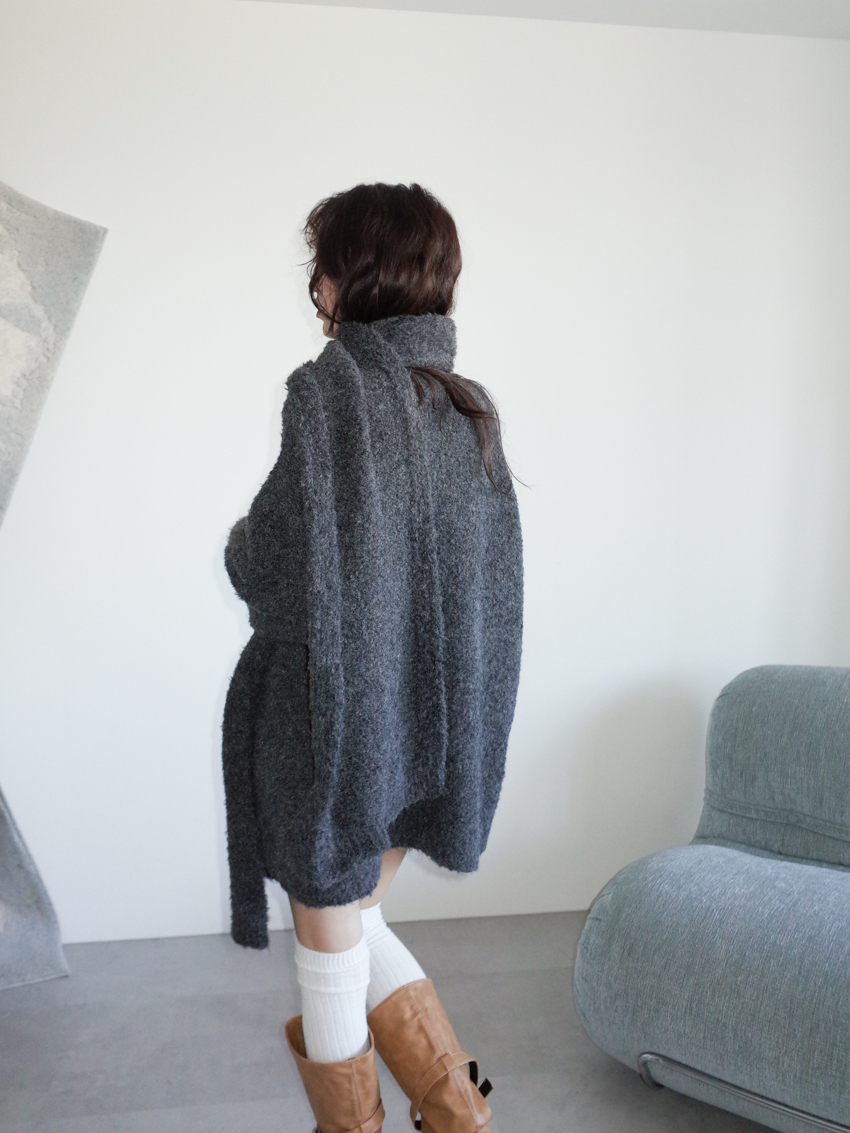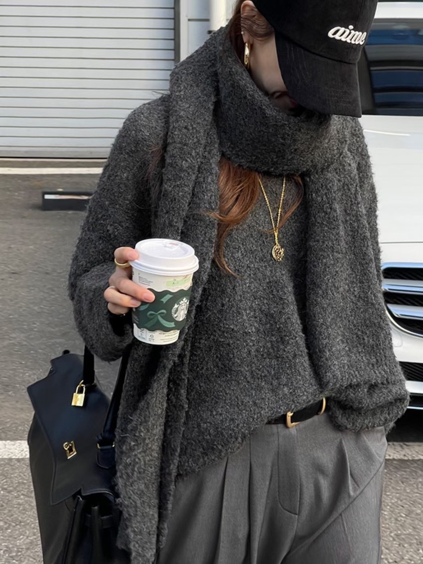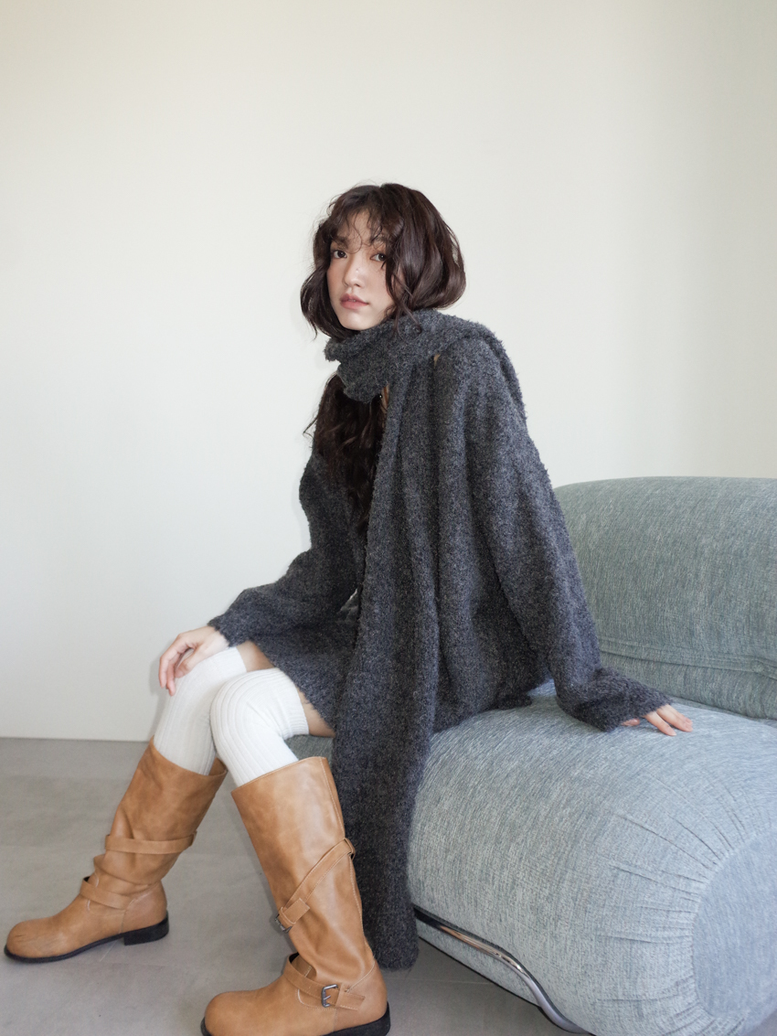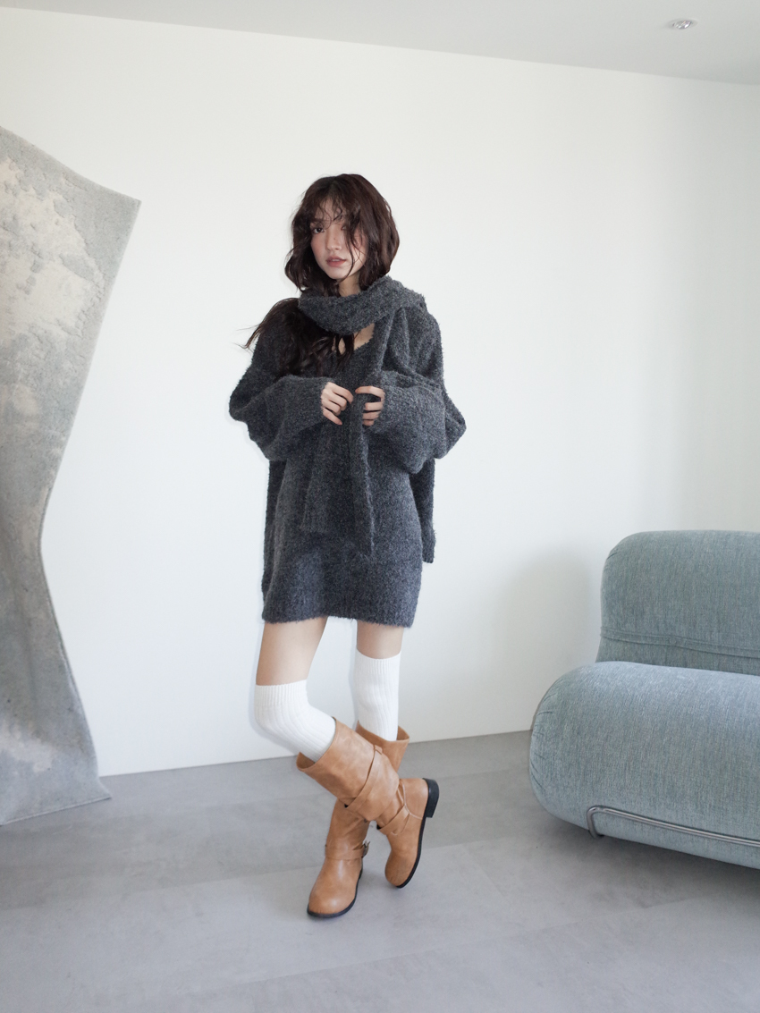 teddy plush slub knit slouchy sweater with scarf