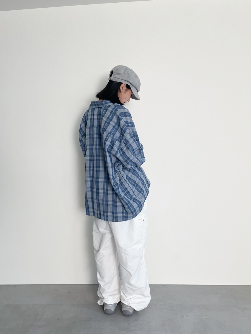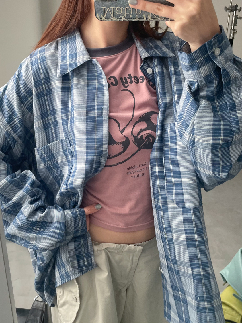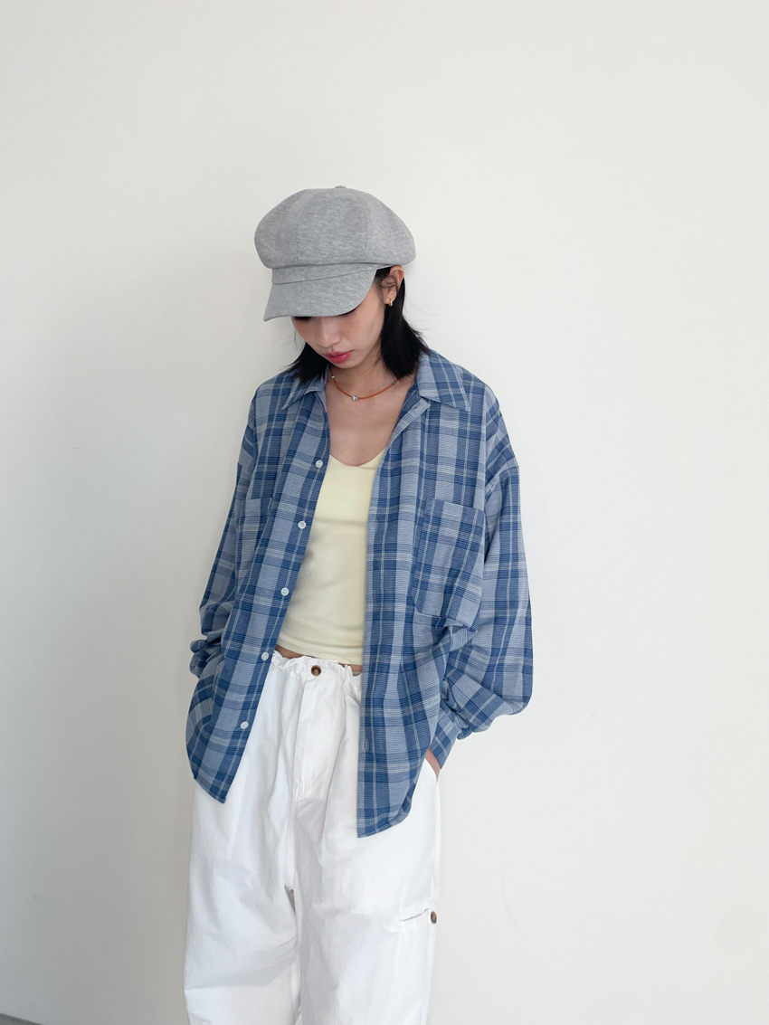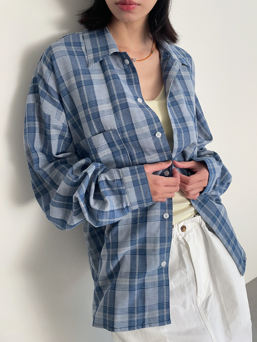 (UNISEX) blue soft loose plaid shirt