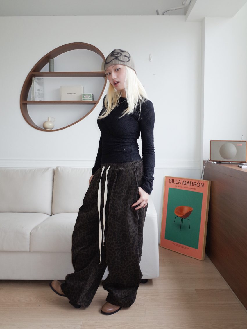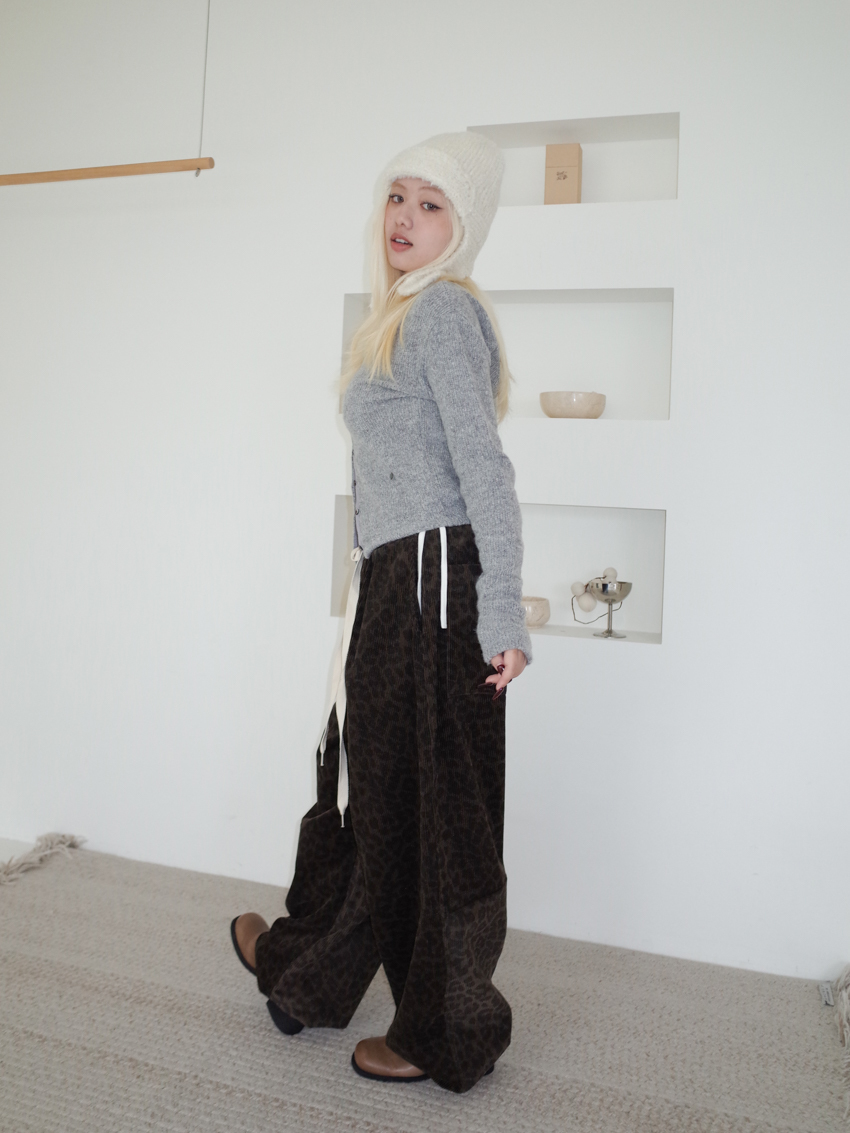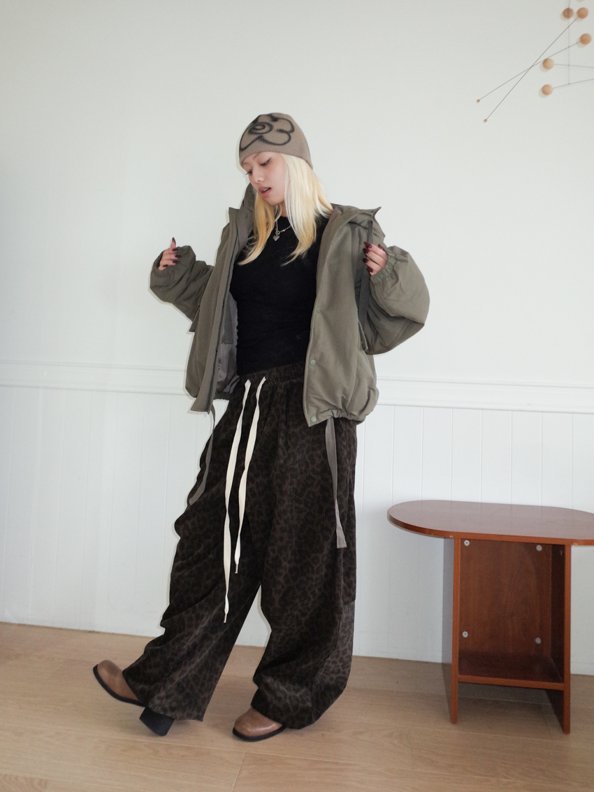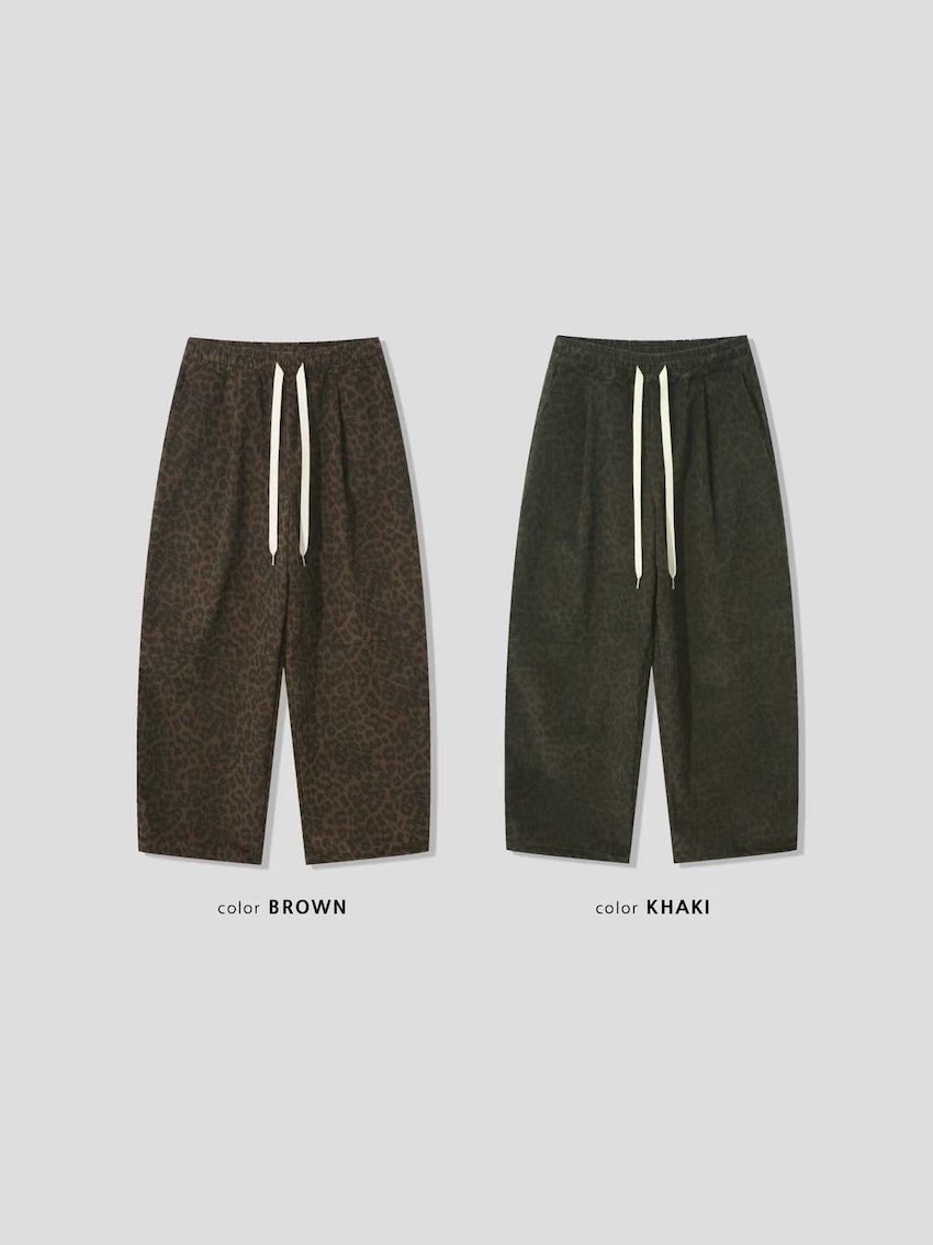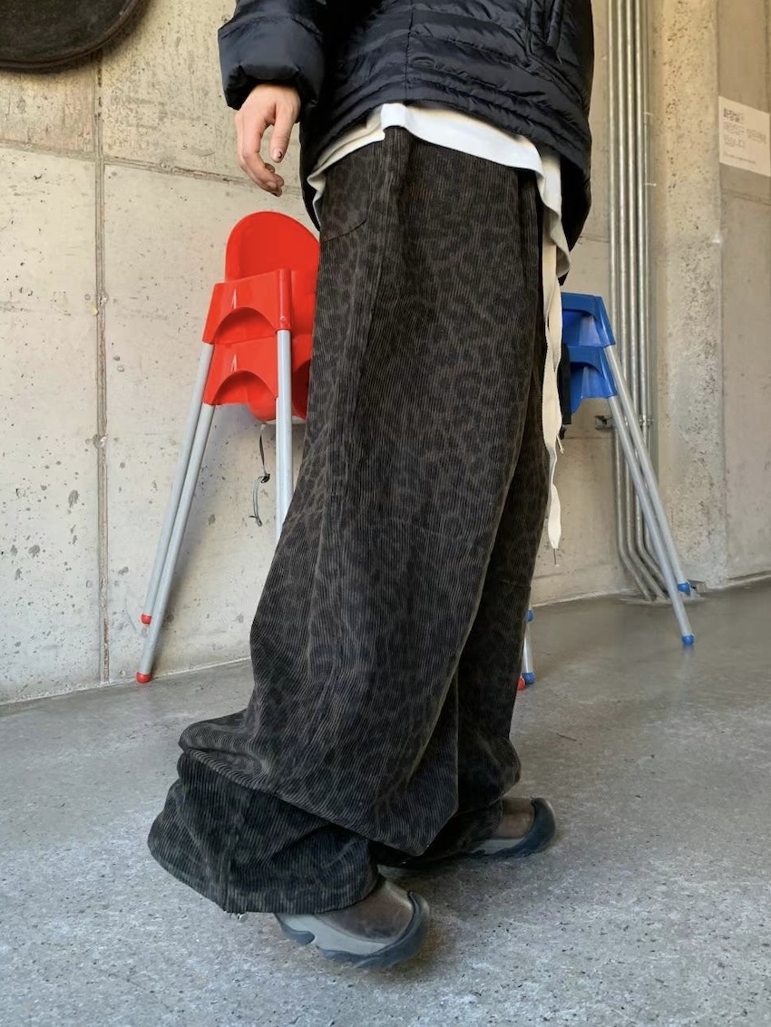 (UNISEX) drawstring waist corduroy leopard print wide trousers