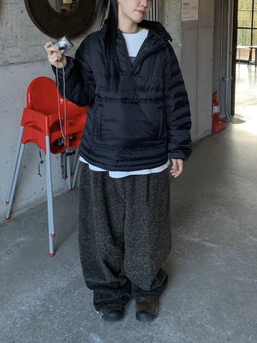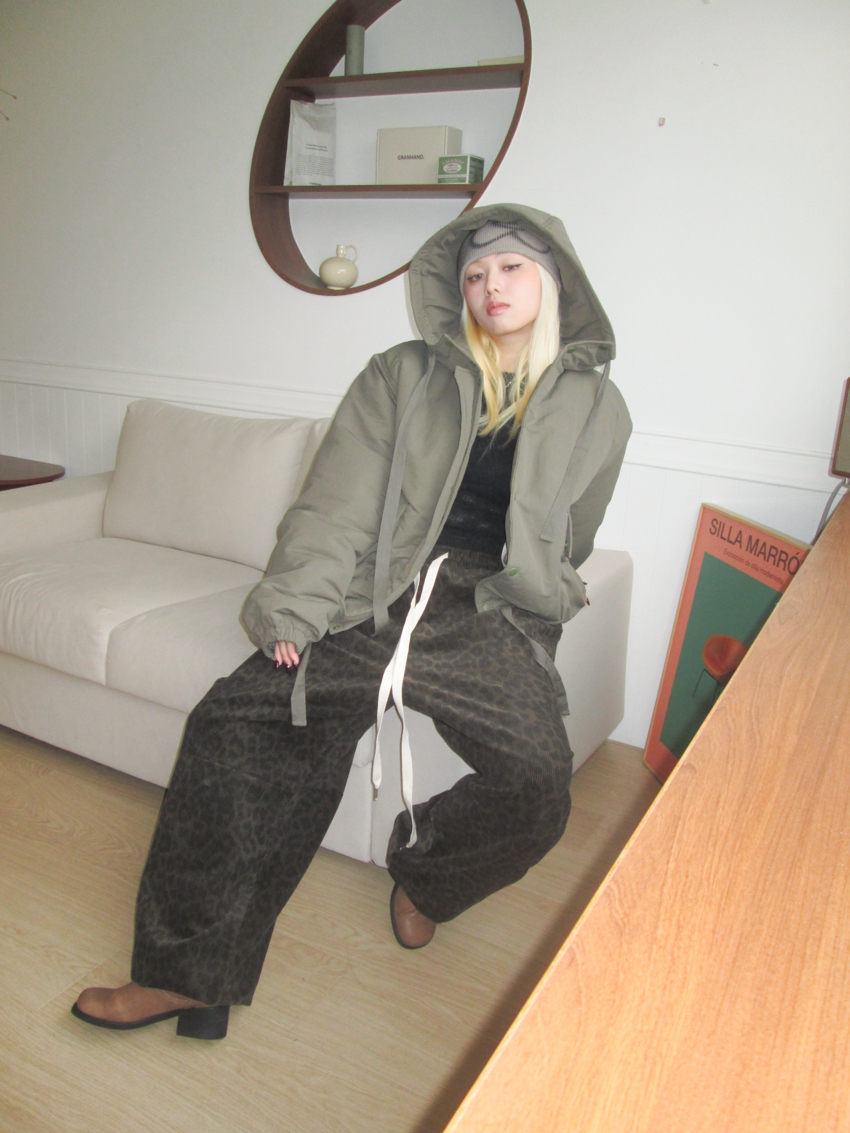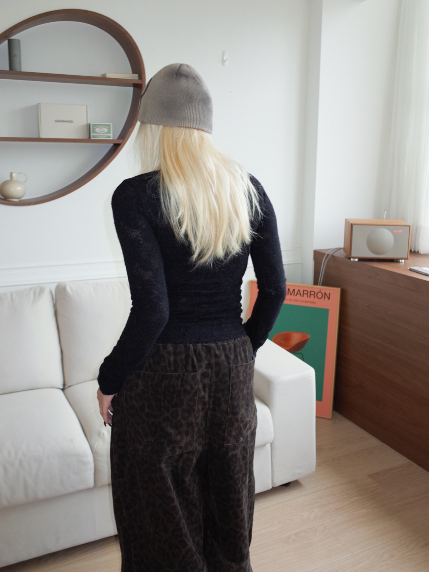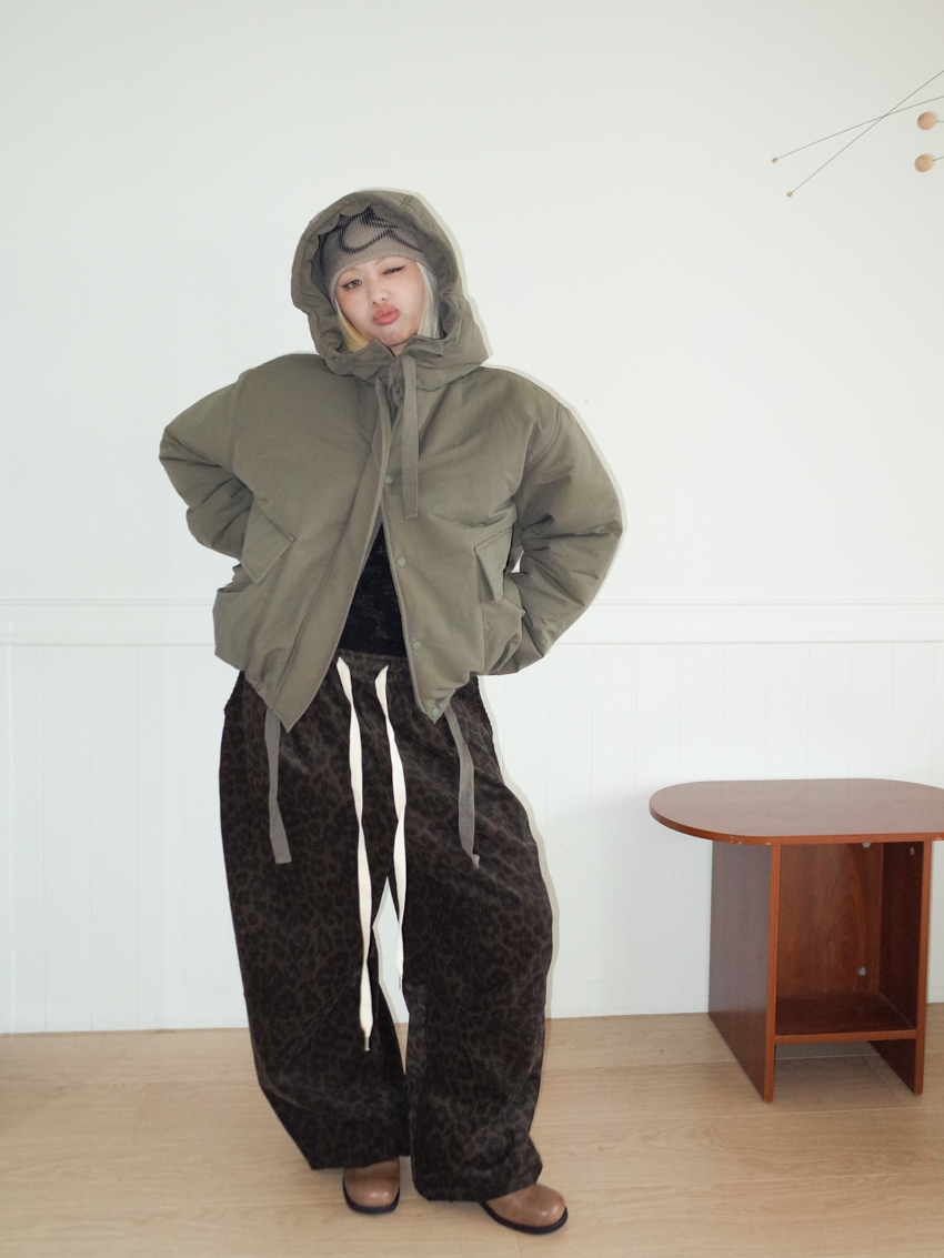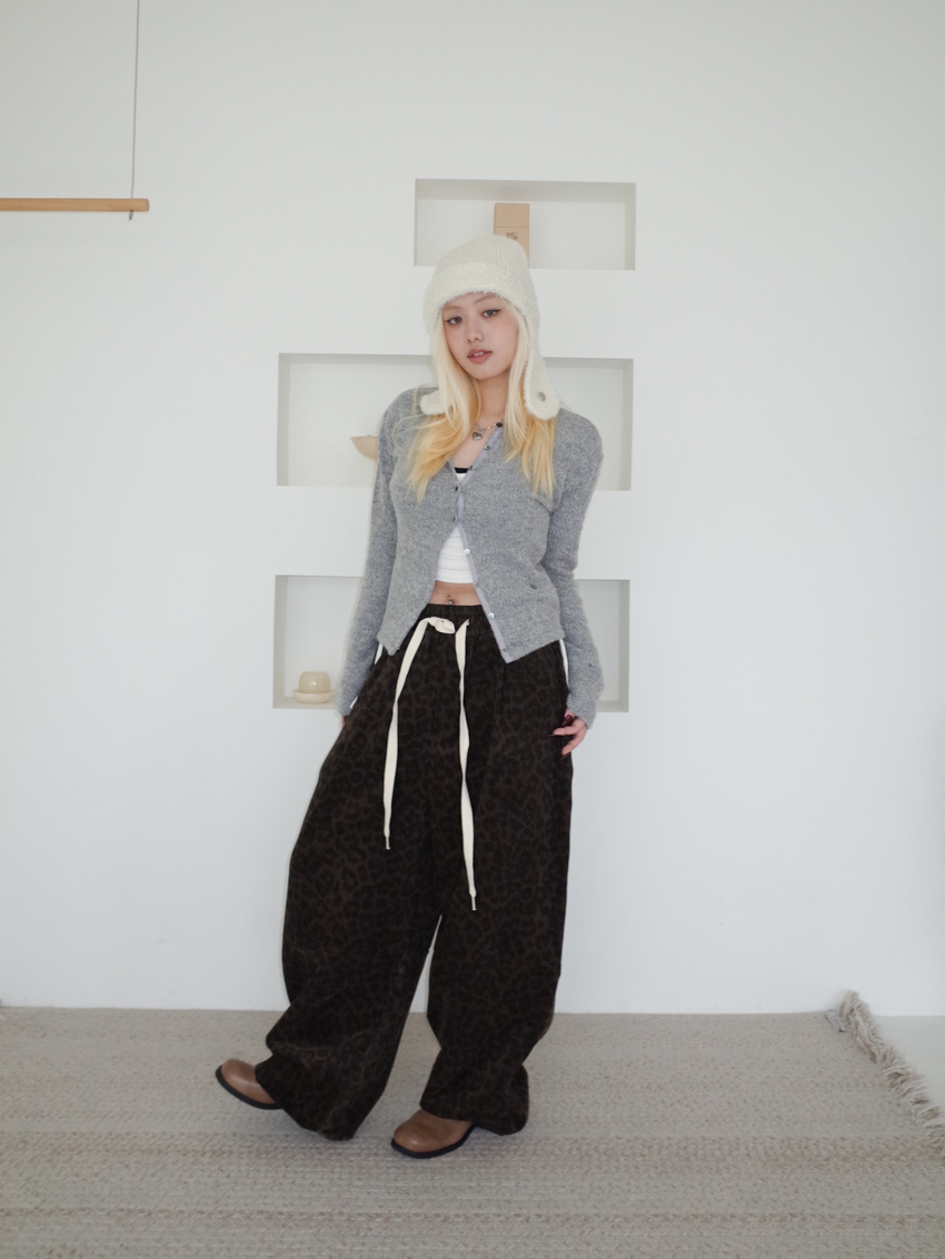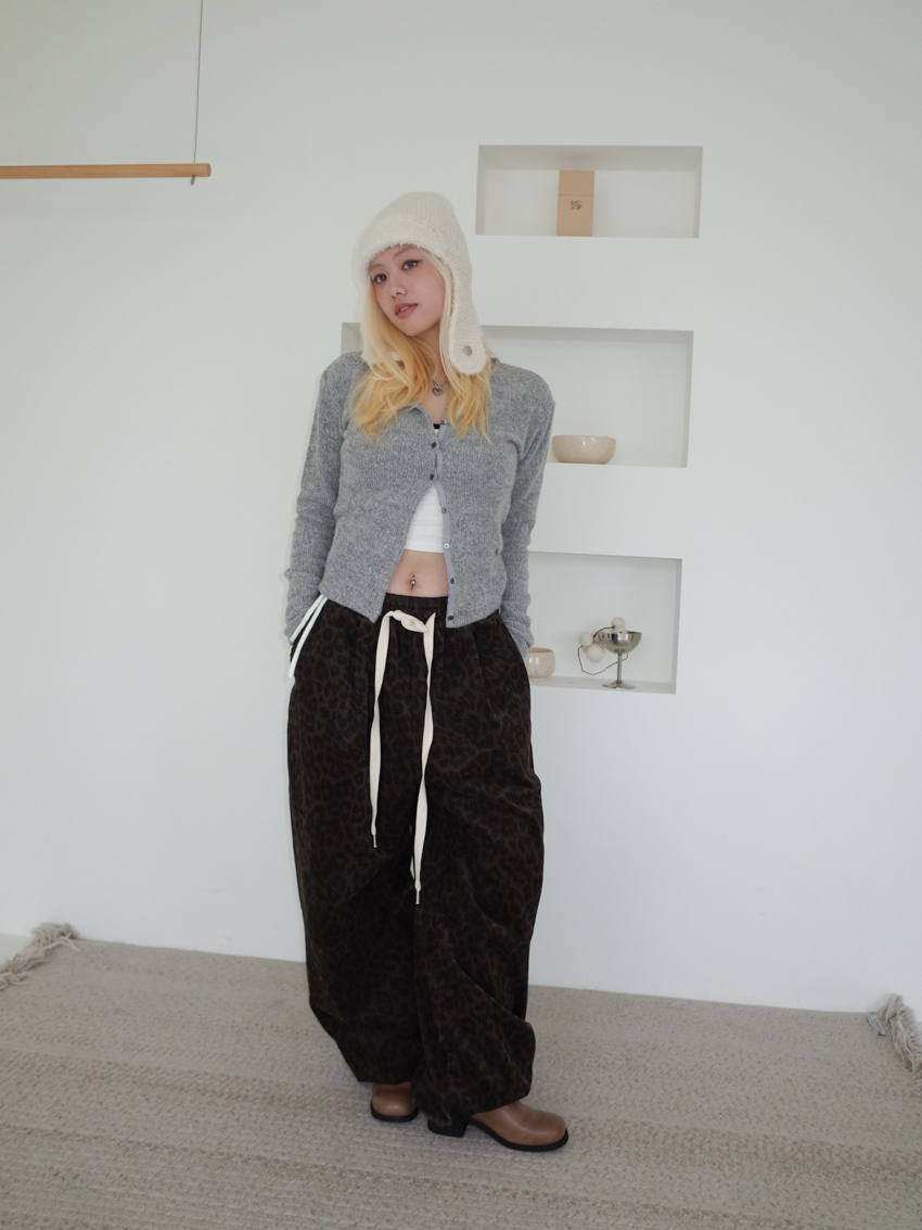 (UNISEX) drawstring waist corduroy leopard print wide trousers