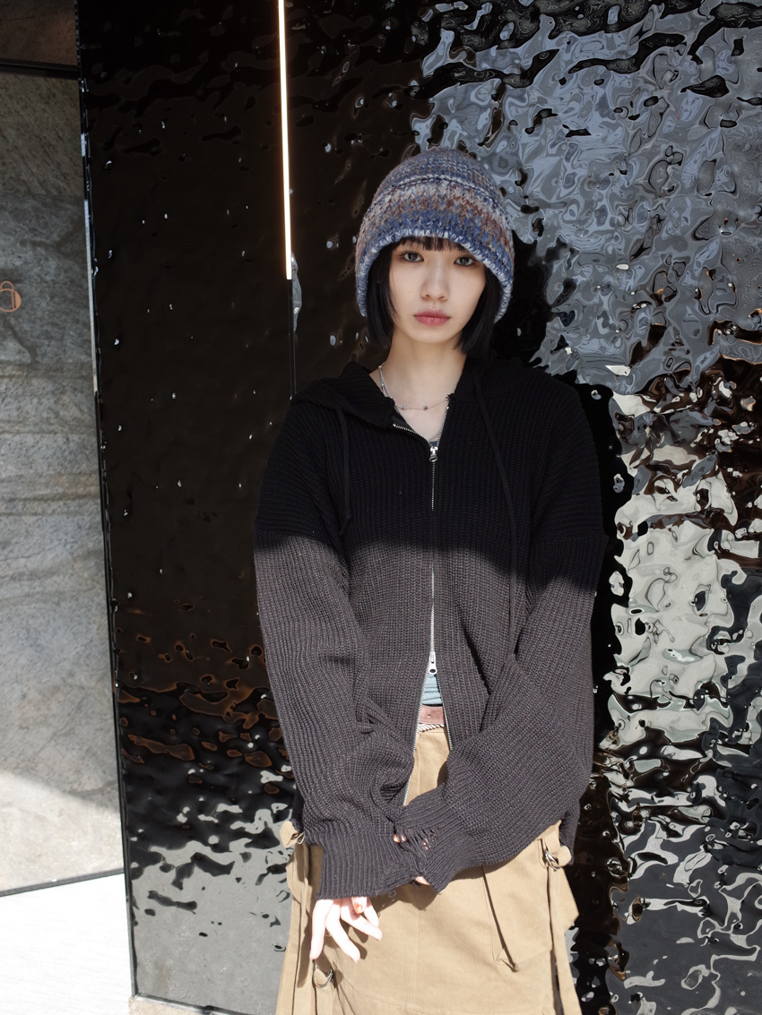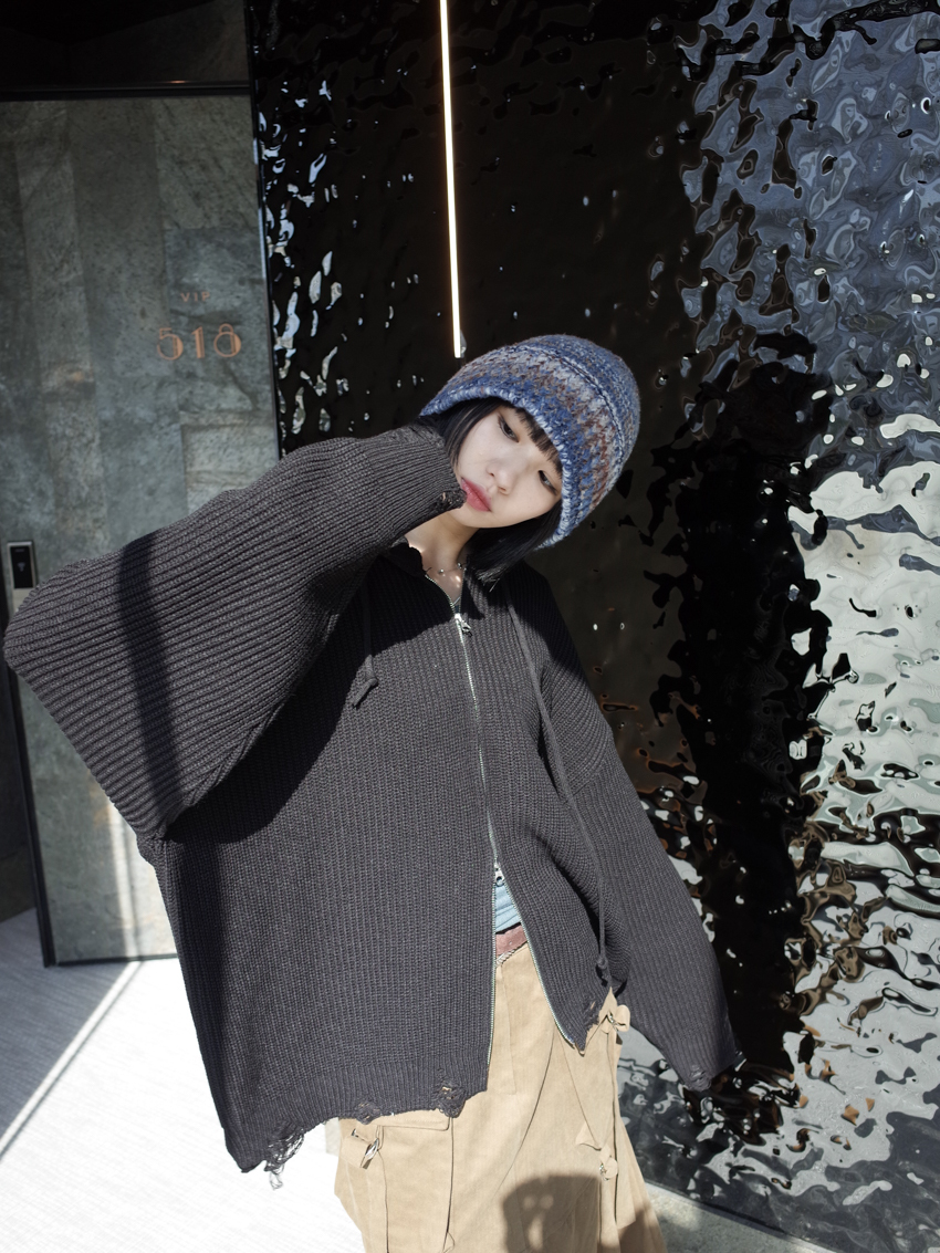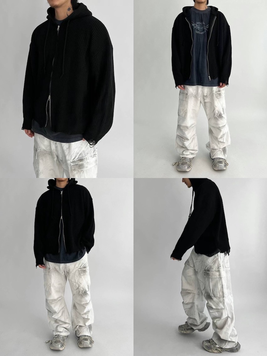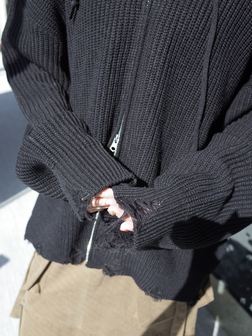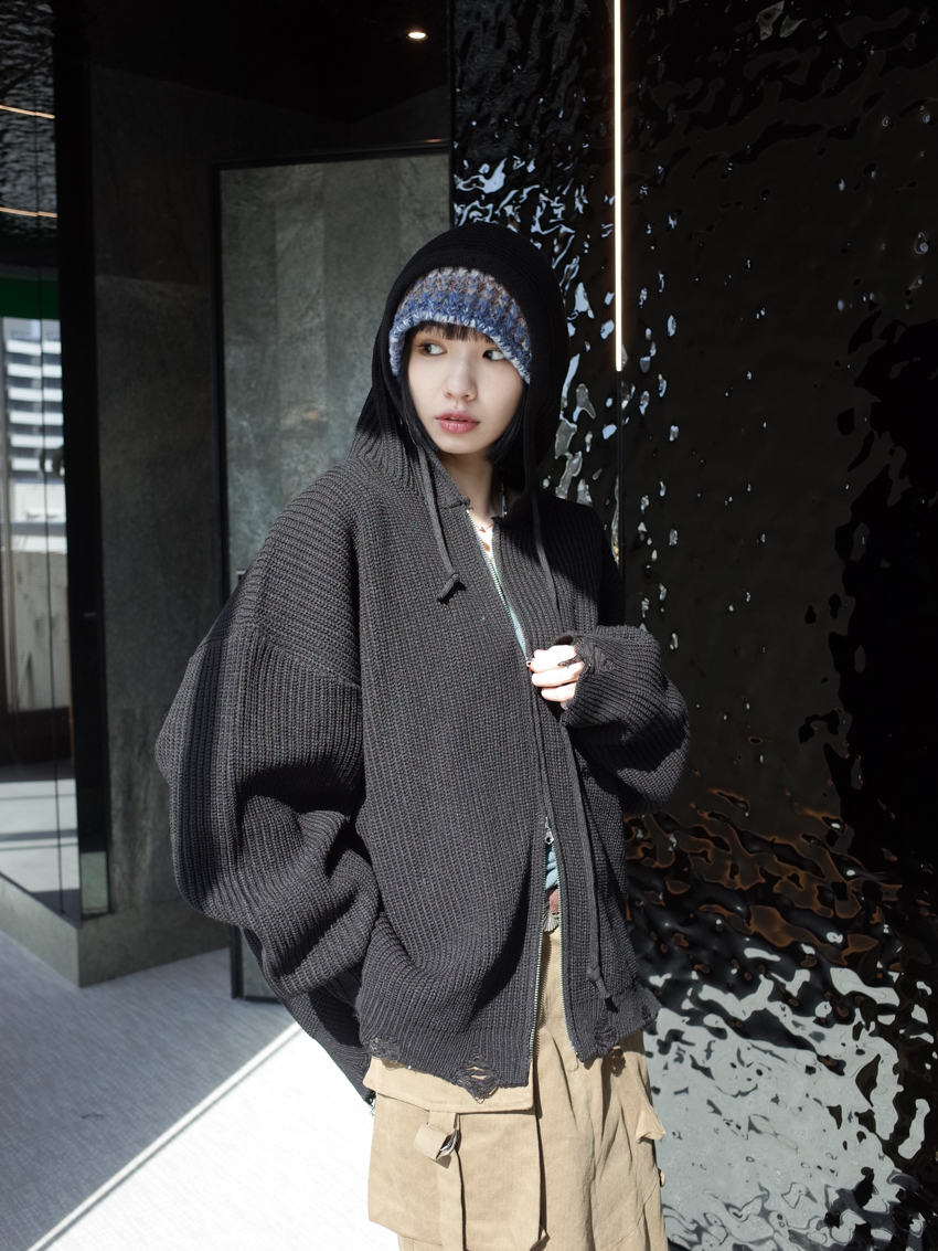 (UNISEX) Finnick double-zip hooded ripped knit jacket