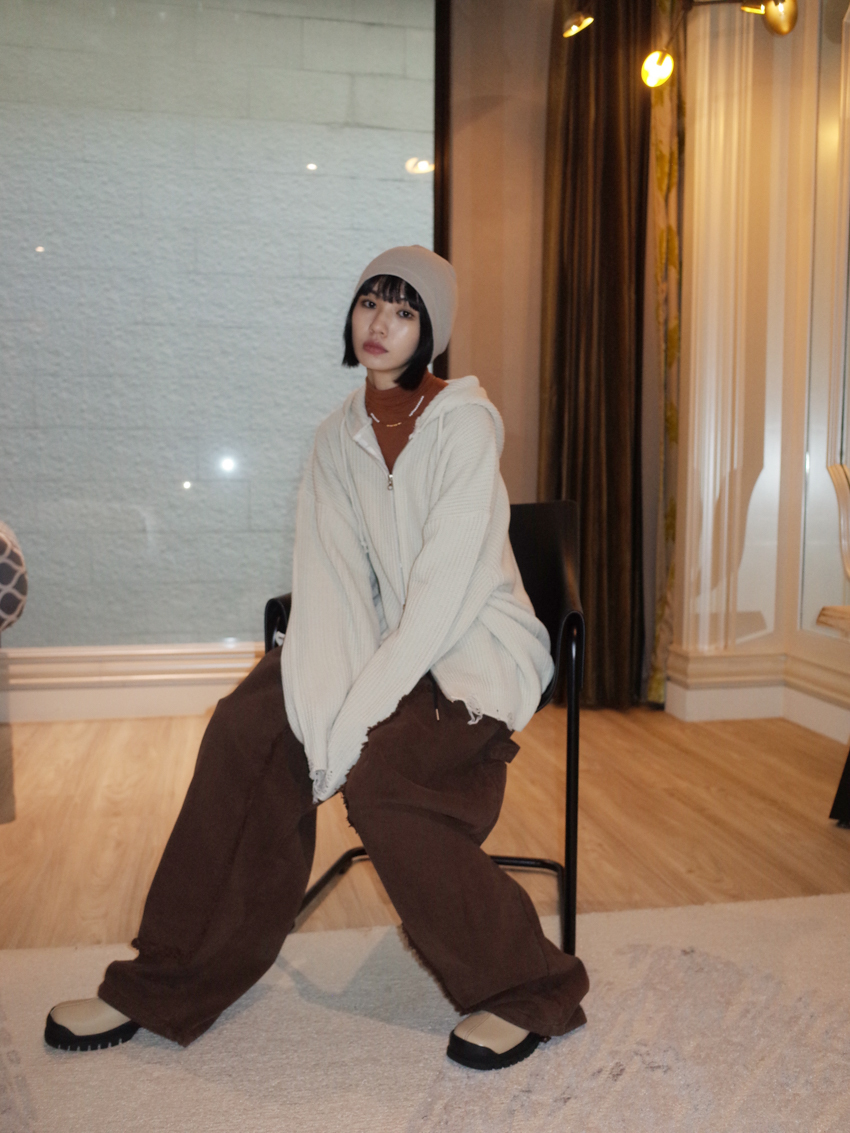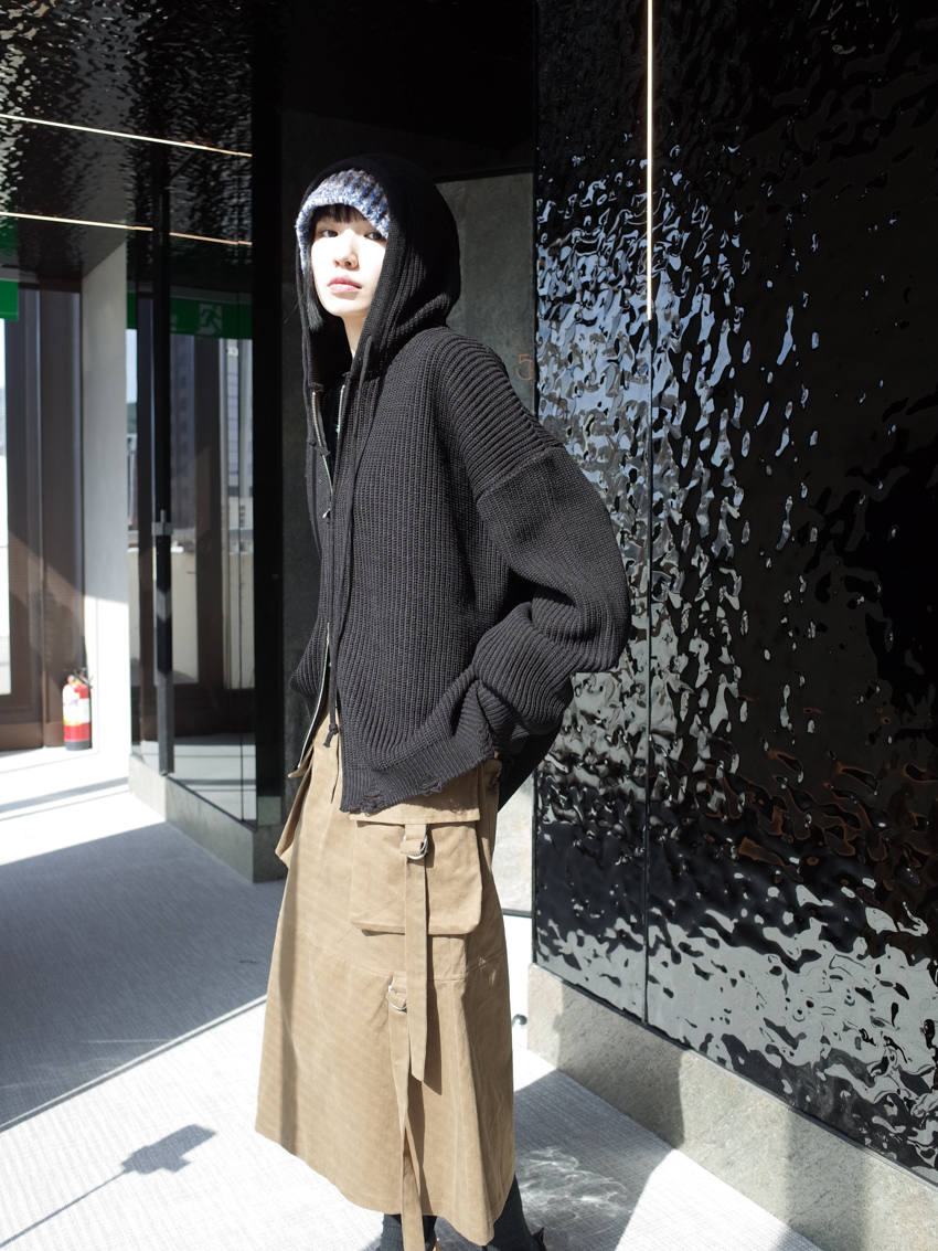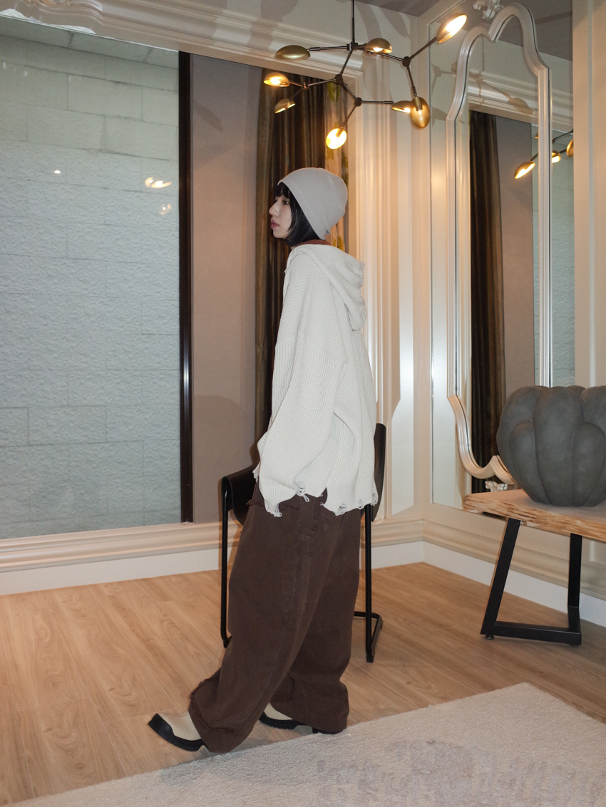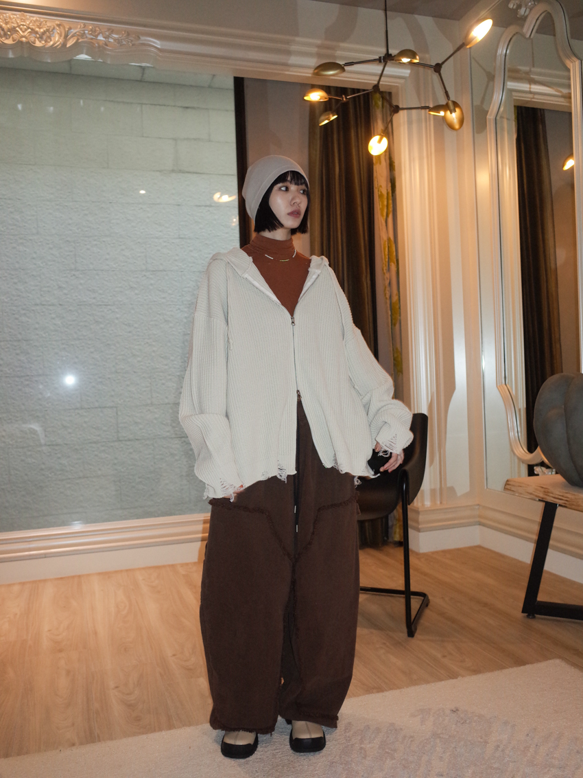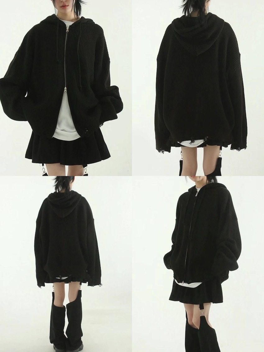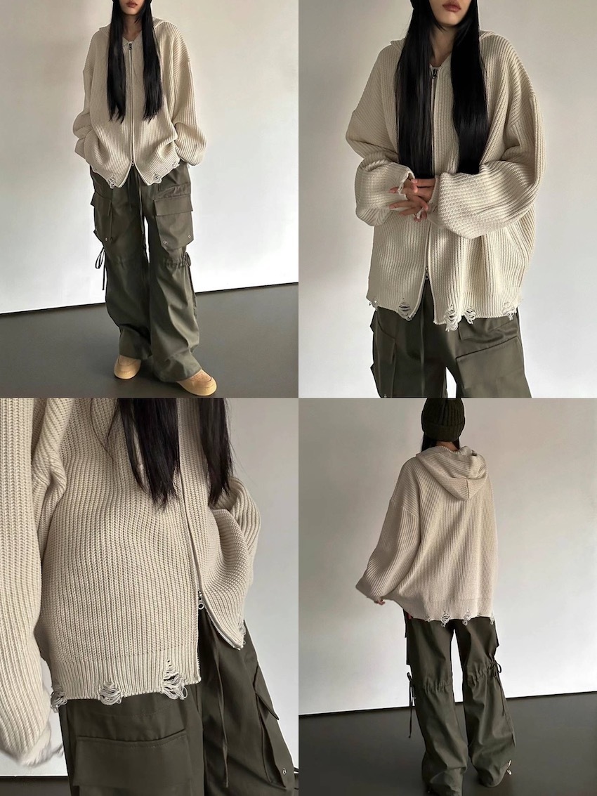 (UNISEX) Finnick double-zip hooded ripped knit jacket