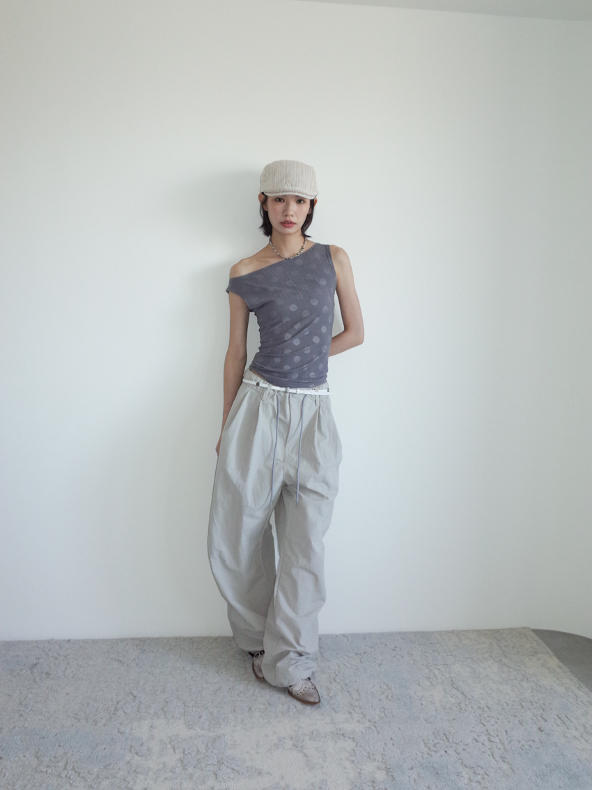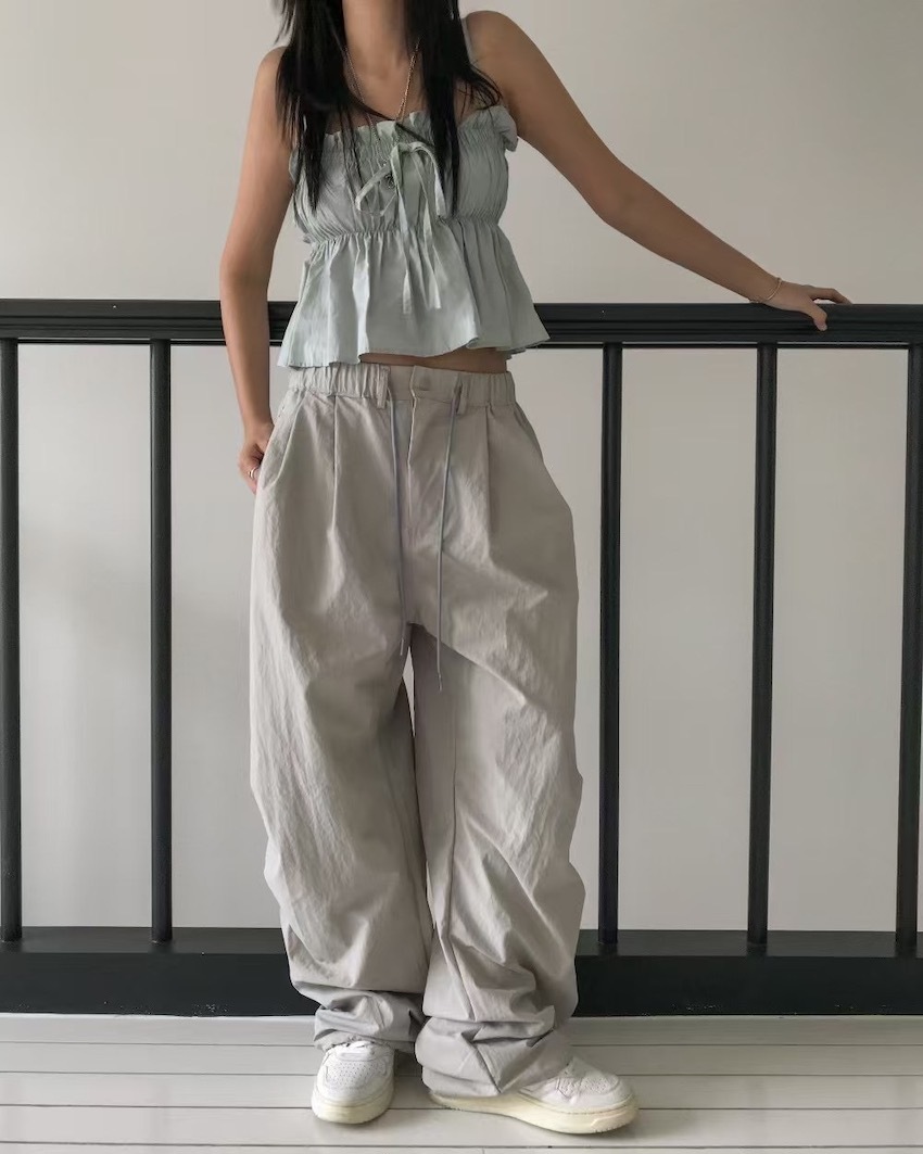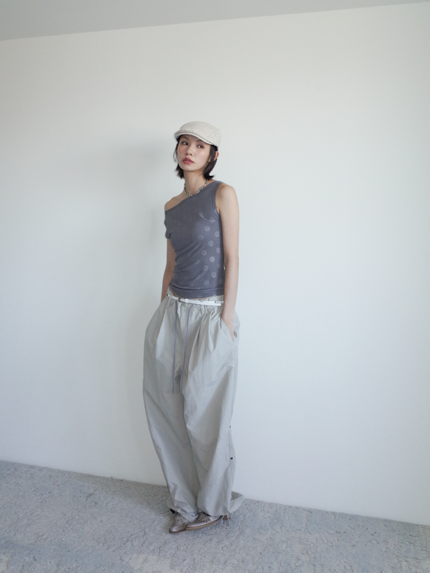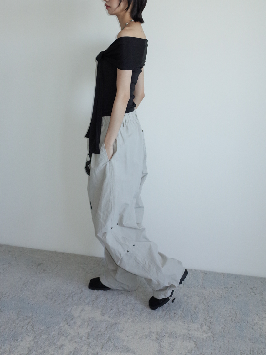 (UNISEX) nylon wide-leg trousers with elastic drawstring waist & round button detail in LIGHT GRAY