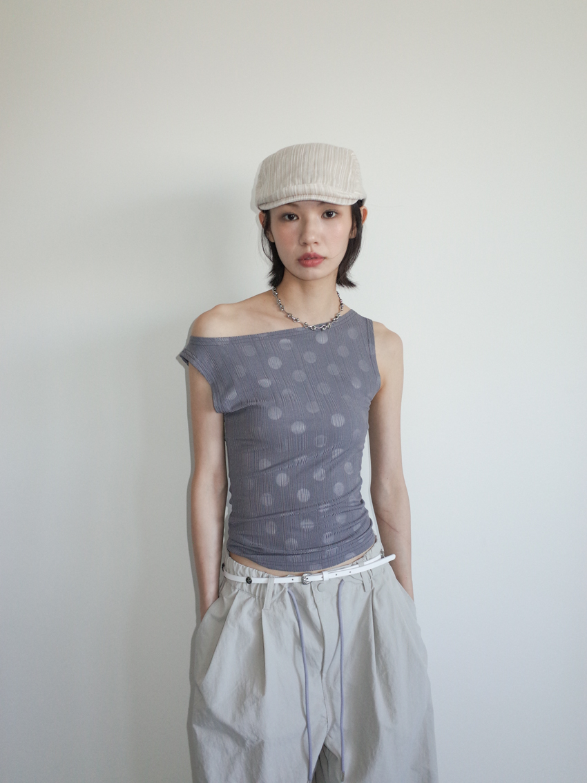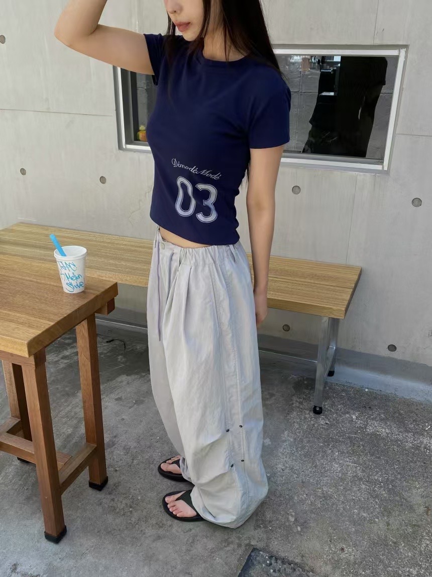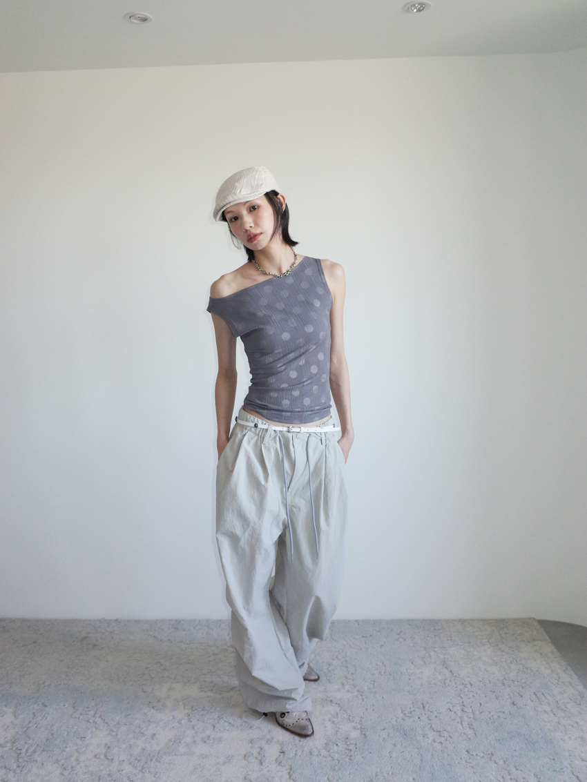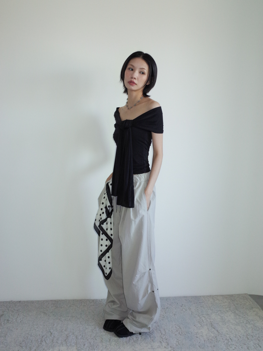 (UNISEX) nylon wide-leg trousers with elastic drawstring waist & round button detail in LIGHT GRAY