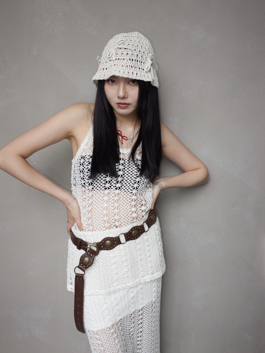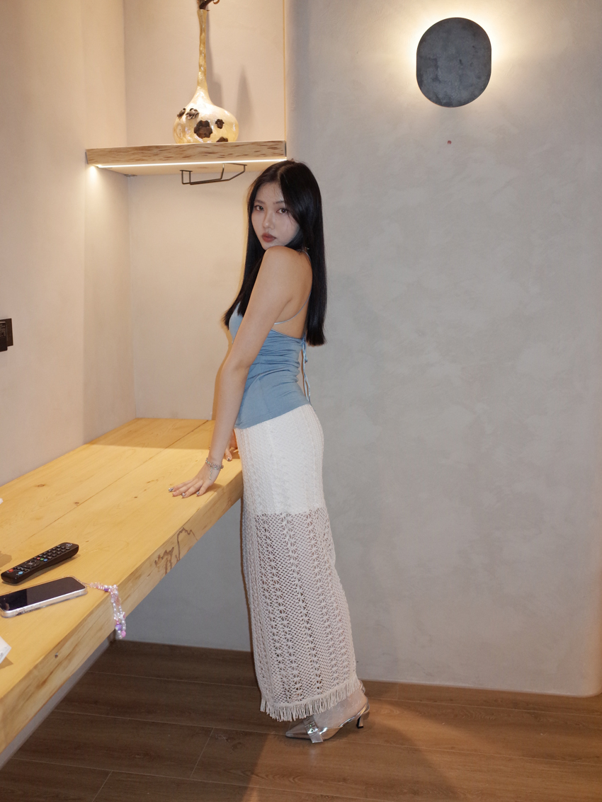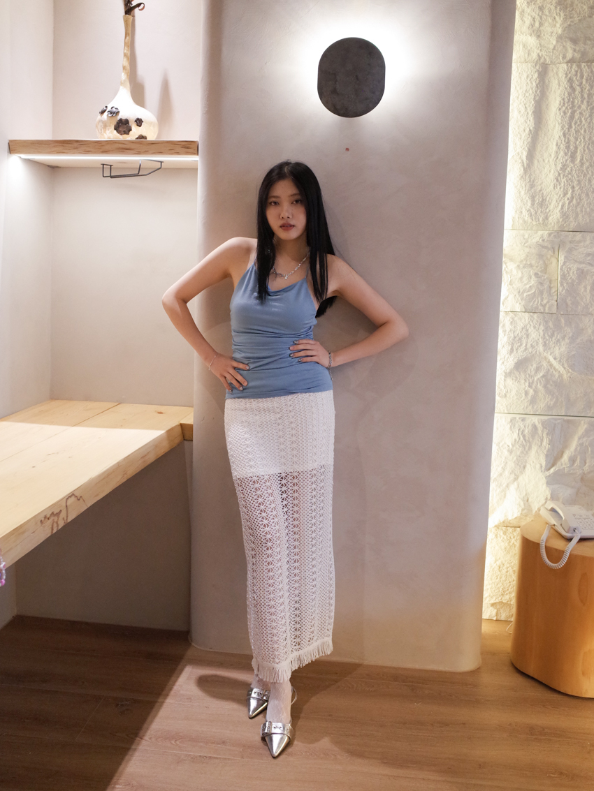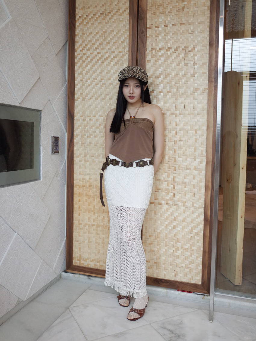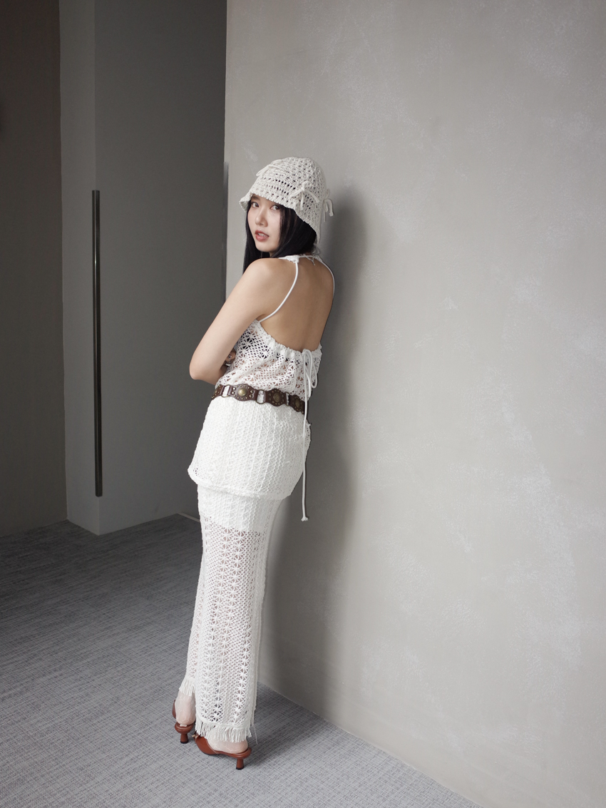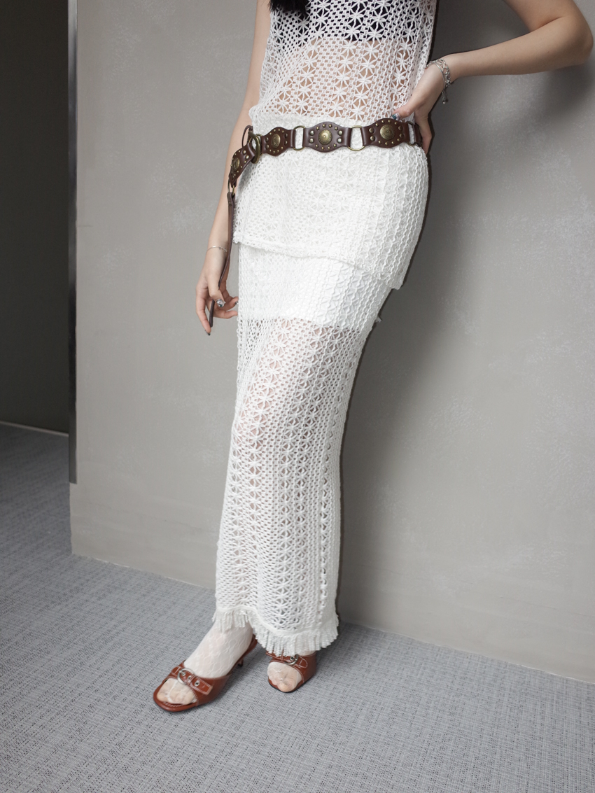 VACATION MODE crocheted strappy vest and fringed long skirt co-ord in IVORY